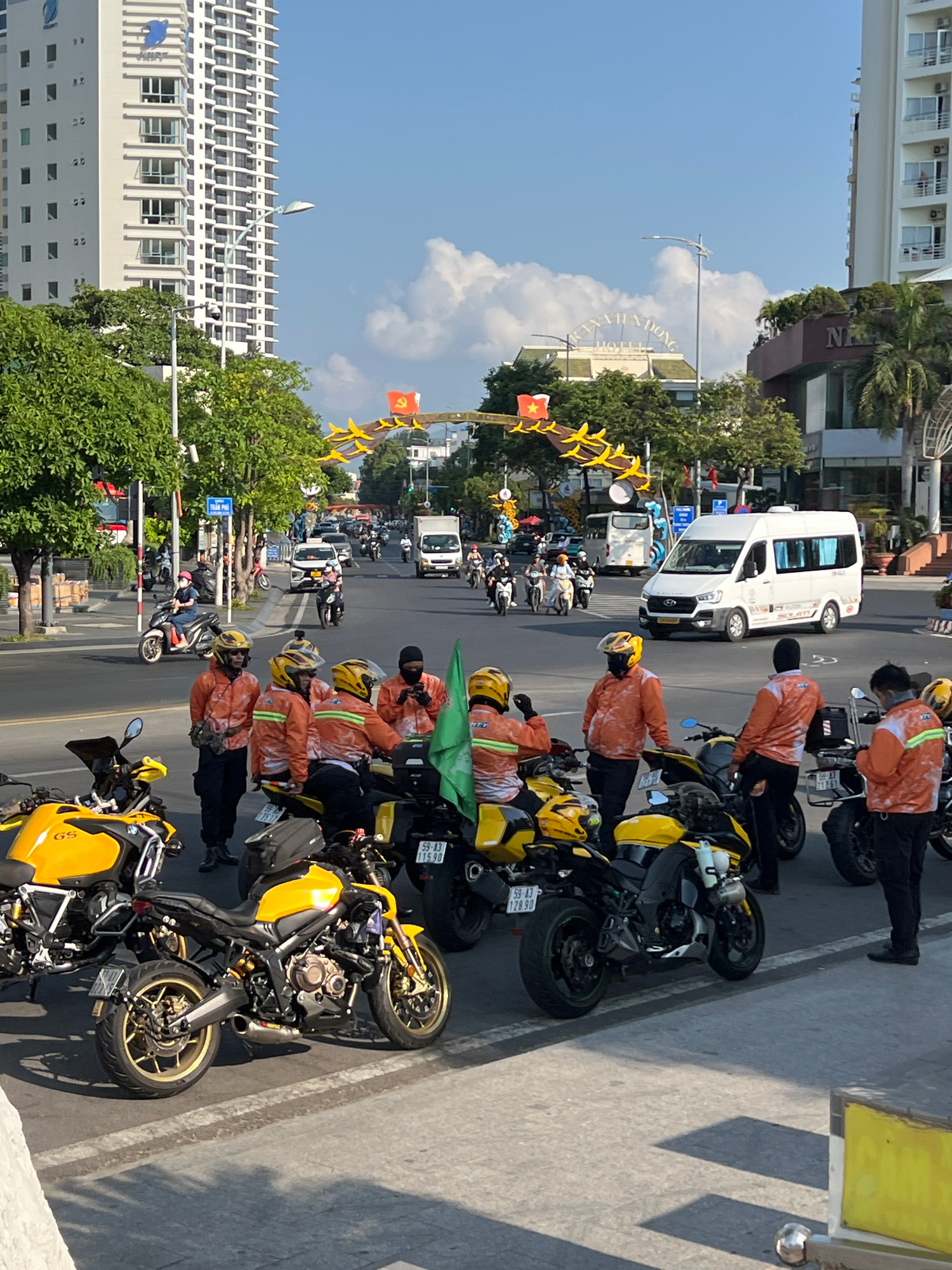 The image shows a street scene in Nha Trang, Vietnam. The perspective is from an elevated position. A row of parked yellow and black BMW motorcycles is arranged along the right side of the frame, with…read more