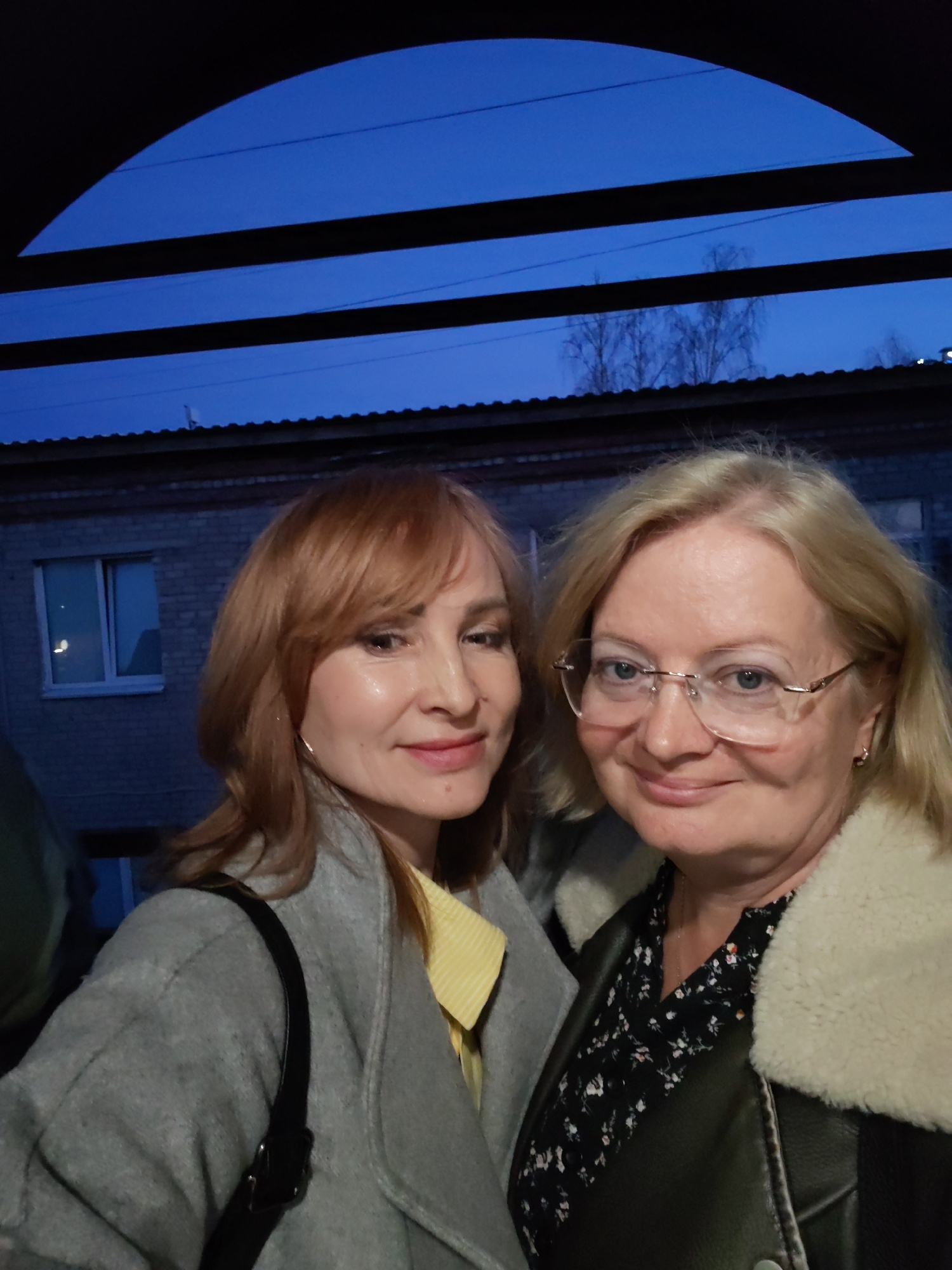 Two women are captured in a close-up selfie-style photograph, taken outdoors in Chaikovsky, Russia, during the evening or night as indicated by the dark blue sky and dim ambient lighting. The woman o…read more