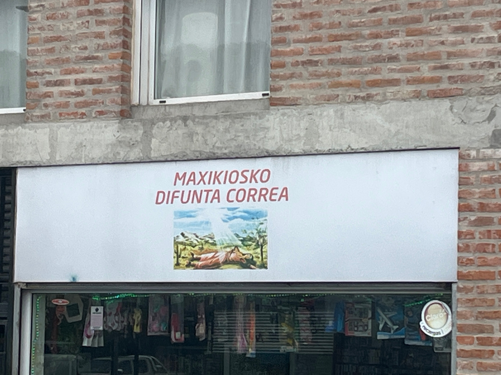 A "Maxikiosko Difunta Correa" convenience store sign is affixed above a window display of merchandise. The sign includes a painting of Difunta Correa, a folk saint. The store is located in a brick bui…read more
