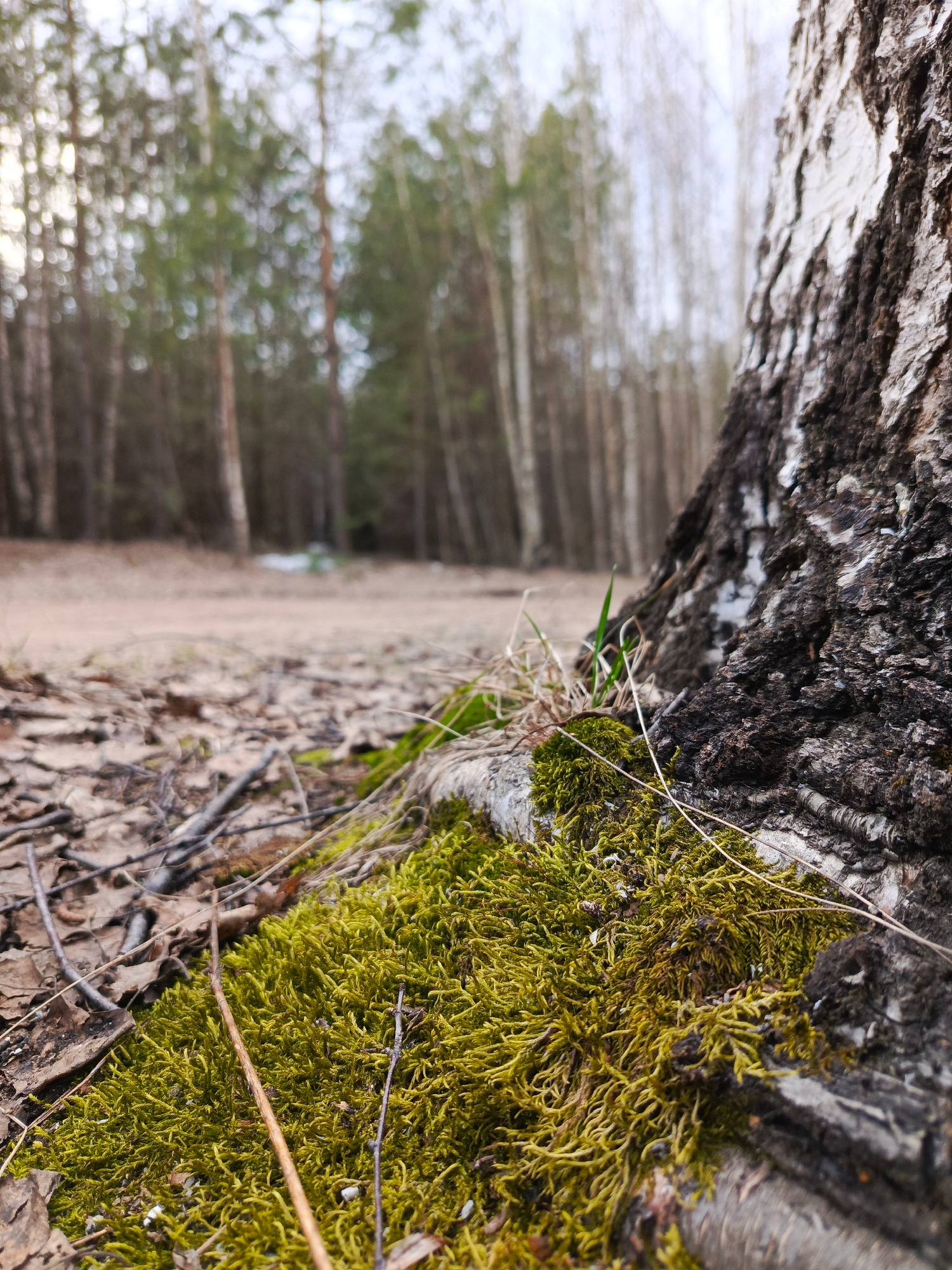 A low-angle, close-up shot captures the base of a tree in a forest setting, likely in Chaikovsky, Russia. The foreground is dominated by vibrant, densely packed green moss clinging to the tree's roots…read more