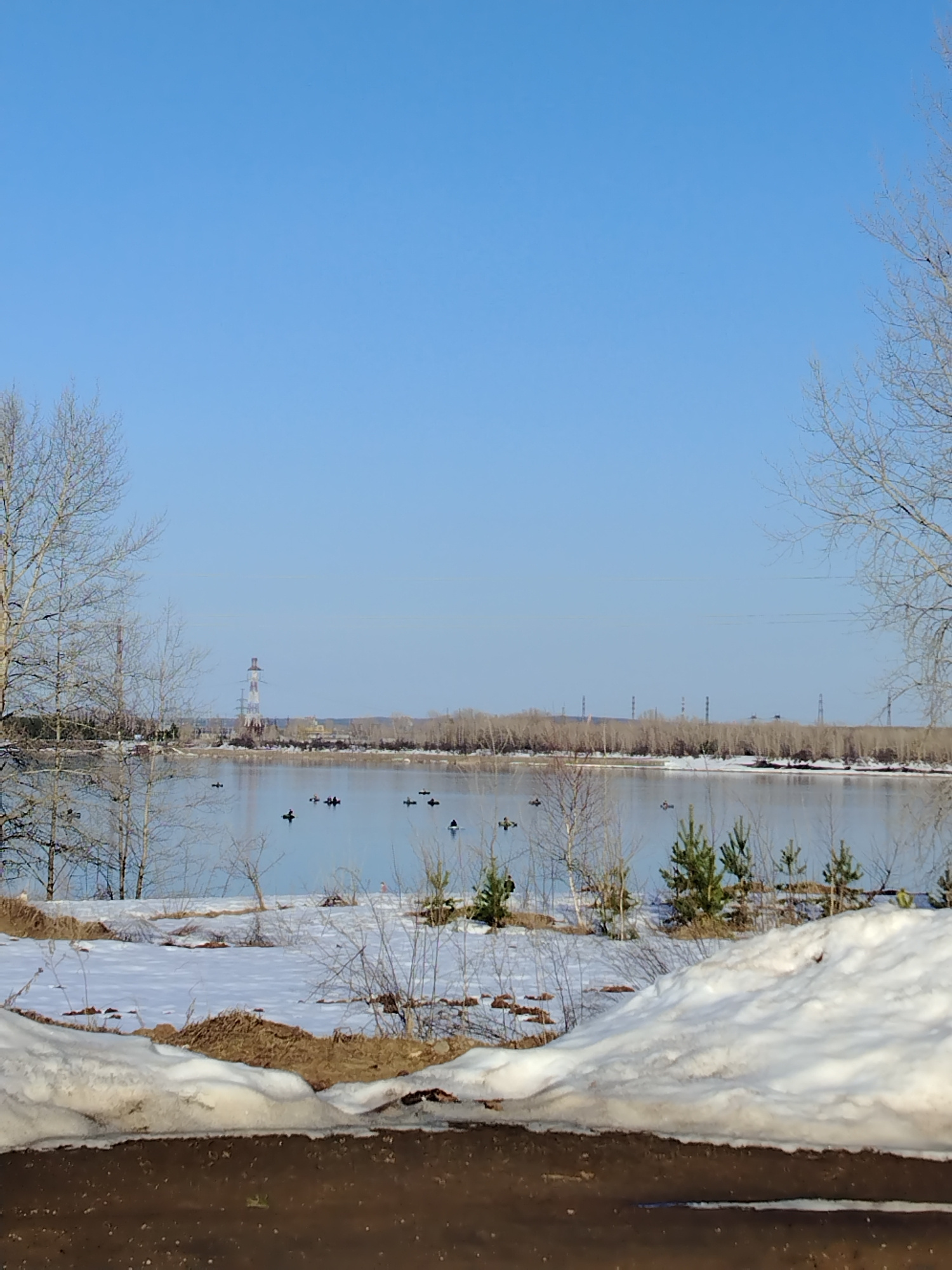 The image presents a landscape in a location identified as Noviy, Russia. It is a daytime scene under a clear, blue sky. The foreground features a dark, possibly wet or muddy surface, with a snowdrift…read more