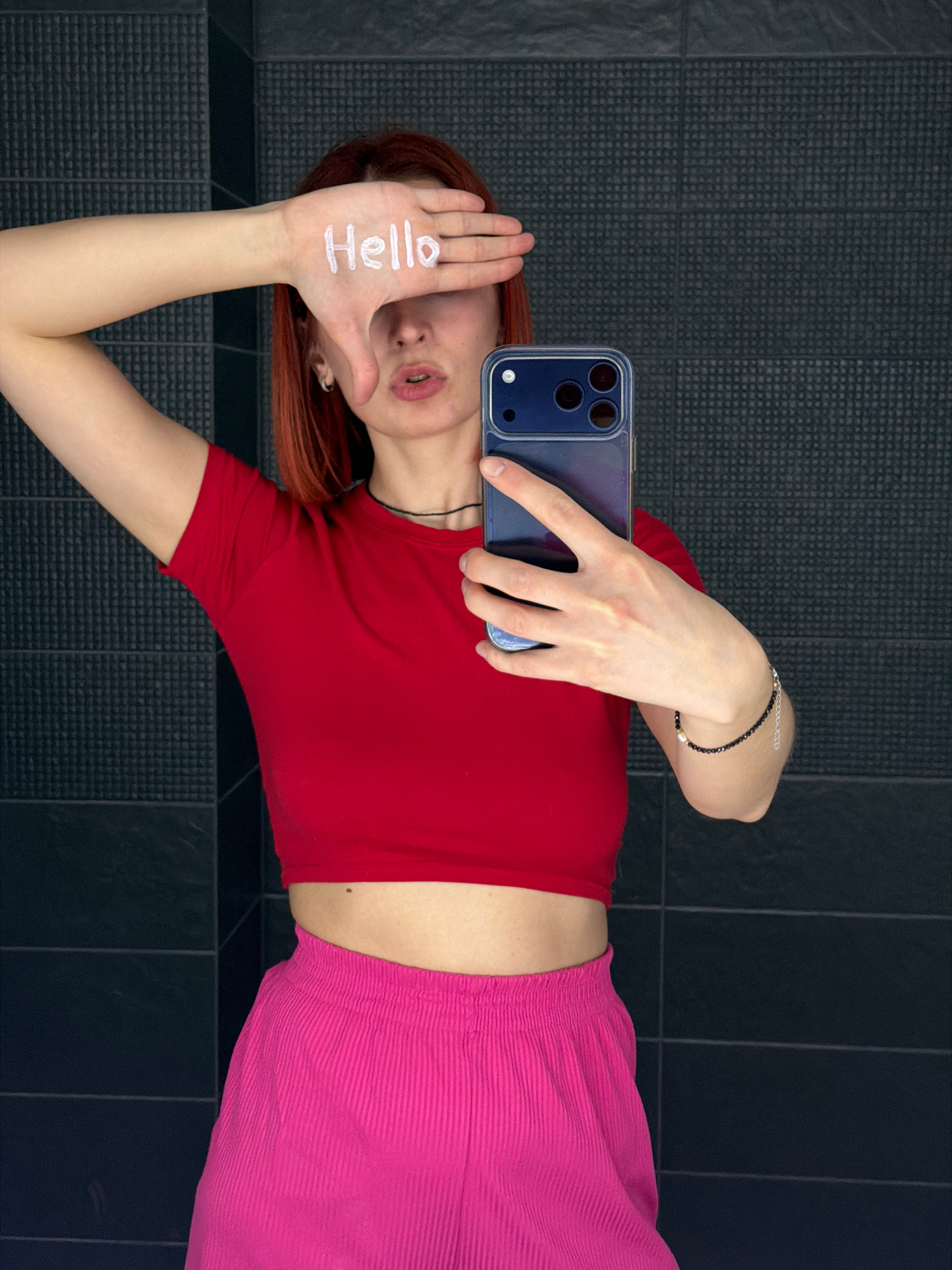 A young woman takes a selfie while lying on a dark tiled floor. She is wearing a red t-shirt and pink pants. She holds her phone in her right hand and covers part of her face with her left hand. The w…read more
