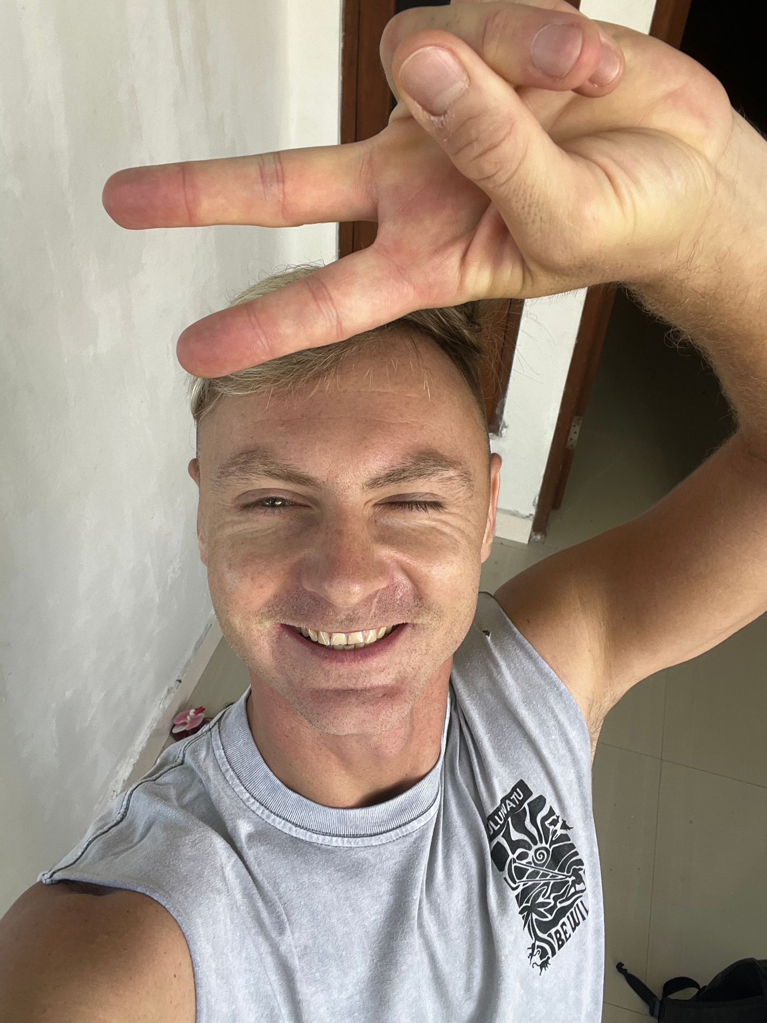 A light-skinned male is positioned in the lower-right of the frame, smiling, and winking with his right eye, suggesting possible voluntary action. He is wearing a grey t-shirt with black graphics incl…read more