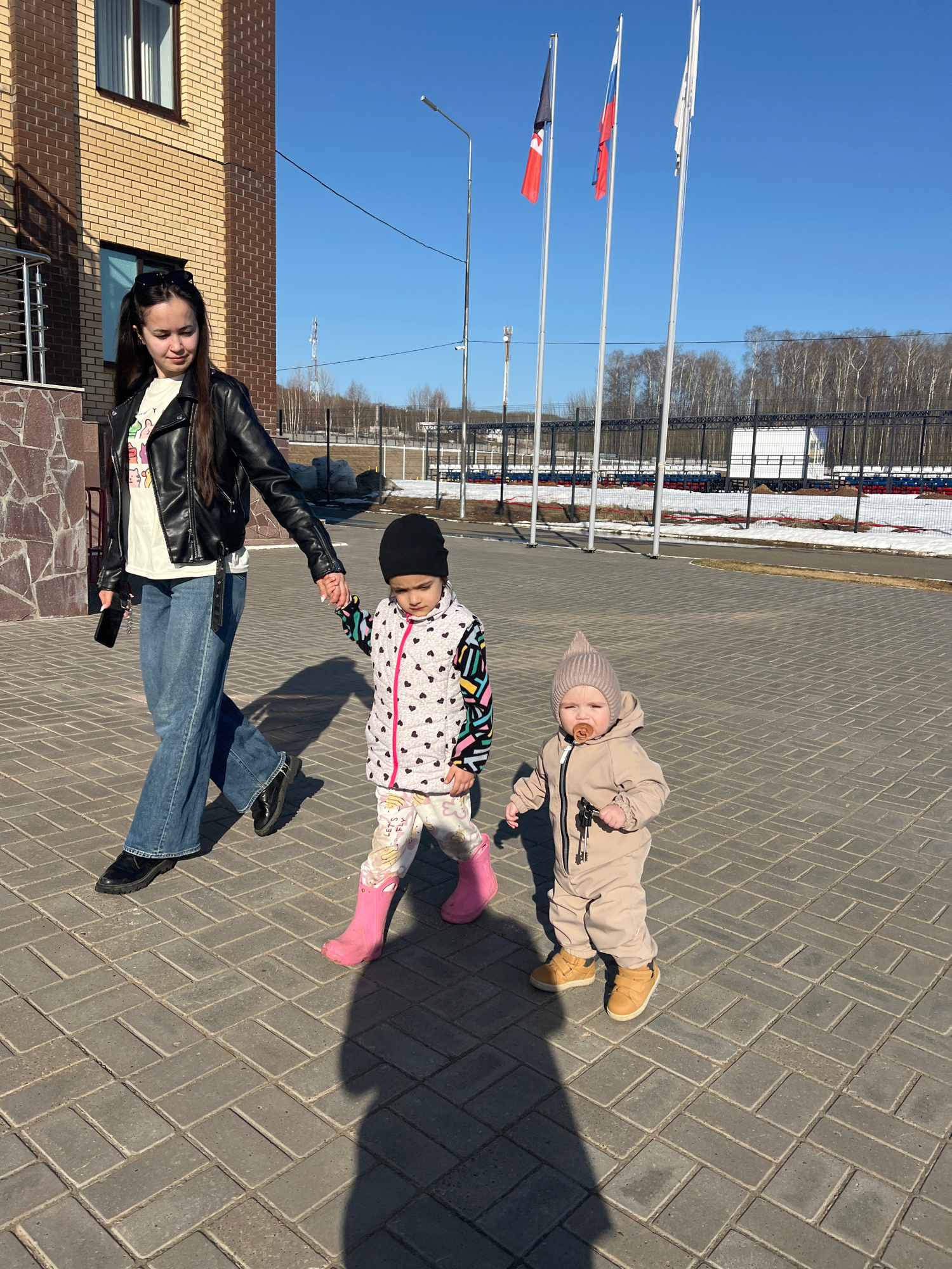 The image shows a woman and two children on a paved surface in Noviy, Russia. The woman, wearing a black leather jacket, blue jeans, and black shoes, holds the hand of a child wearing a white patterne…read more