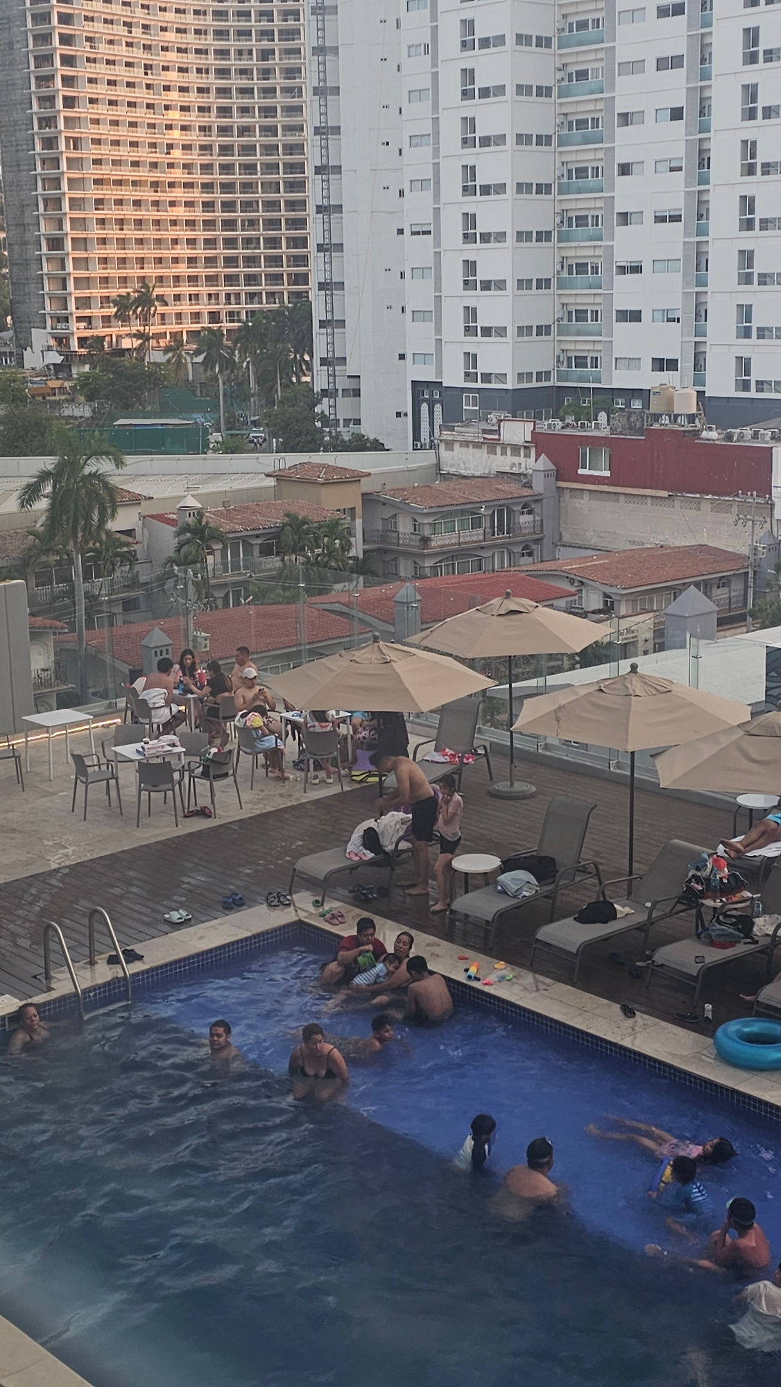 The image depicts a rooftop swimming pool in Acapulco, Mexico. Several people are swimming and standing in the pool, including children and adults. Lounge chairs and tables with umbrellas are situatedβ¦read more