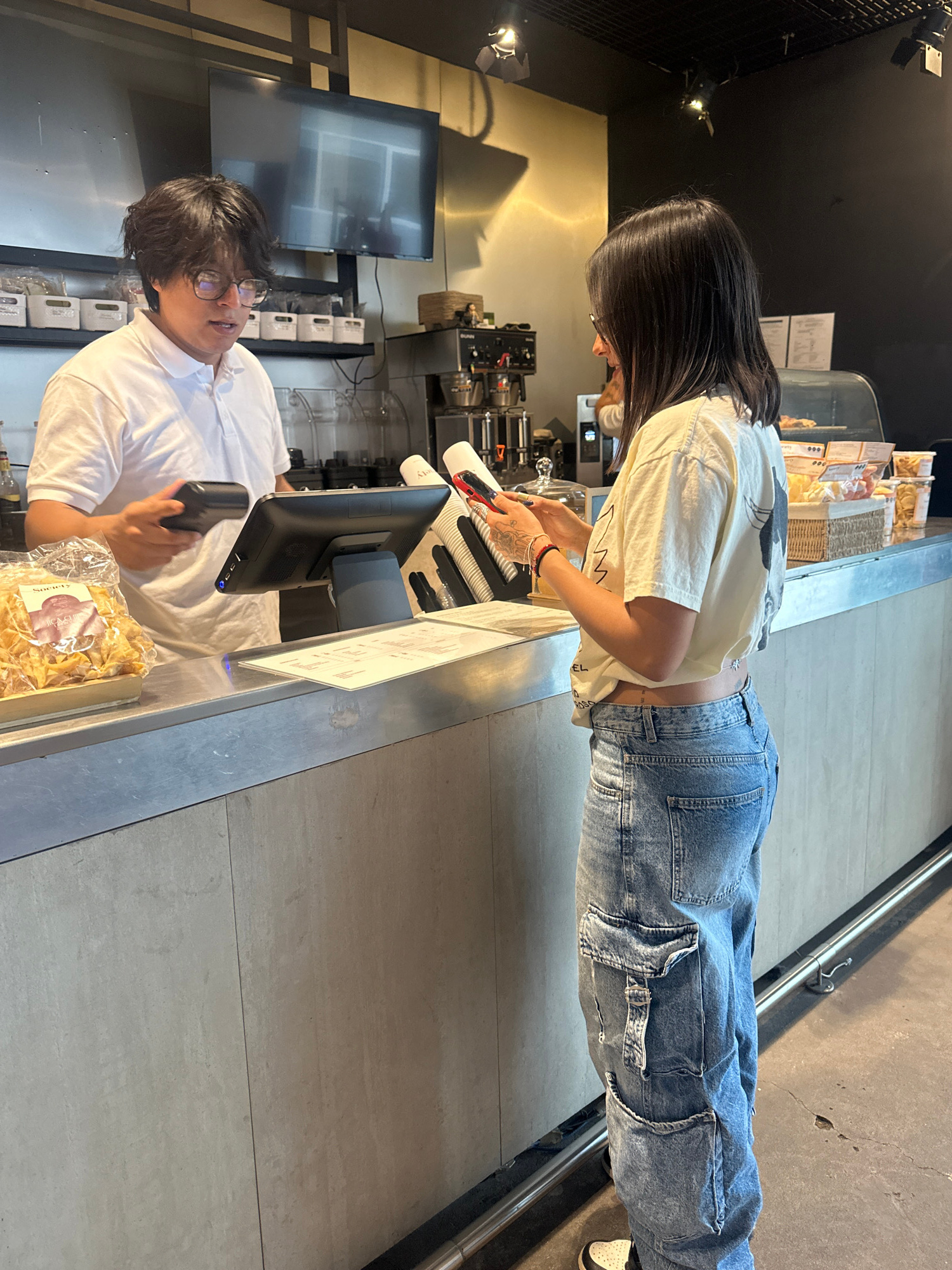 The image shows a cashier and a customer at a cafe or restaurant. The customer, a young woman with long dark hair, is wearing a light-colored t-shirt and blue jeans, standing at the counter and lookin…read more