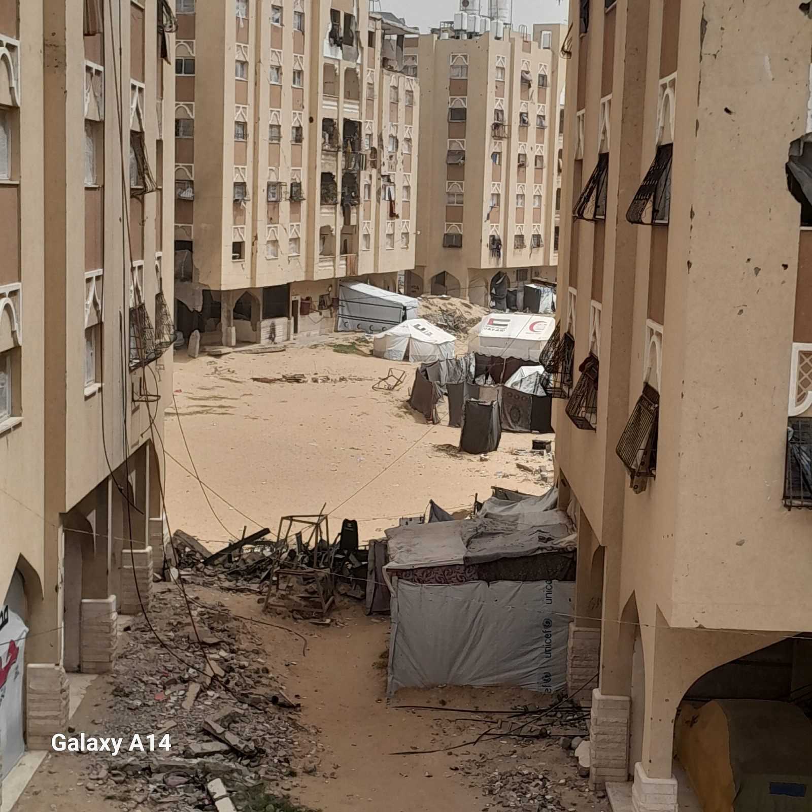 The image shows a street in Khan Yunis, Palestinian Territory. Several multi-story apartment buildings line the street, with many windows blown out or damaged. Tents and makeshift shelters are set up…read more