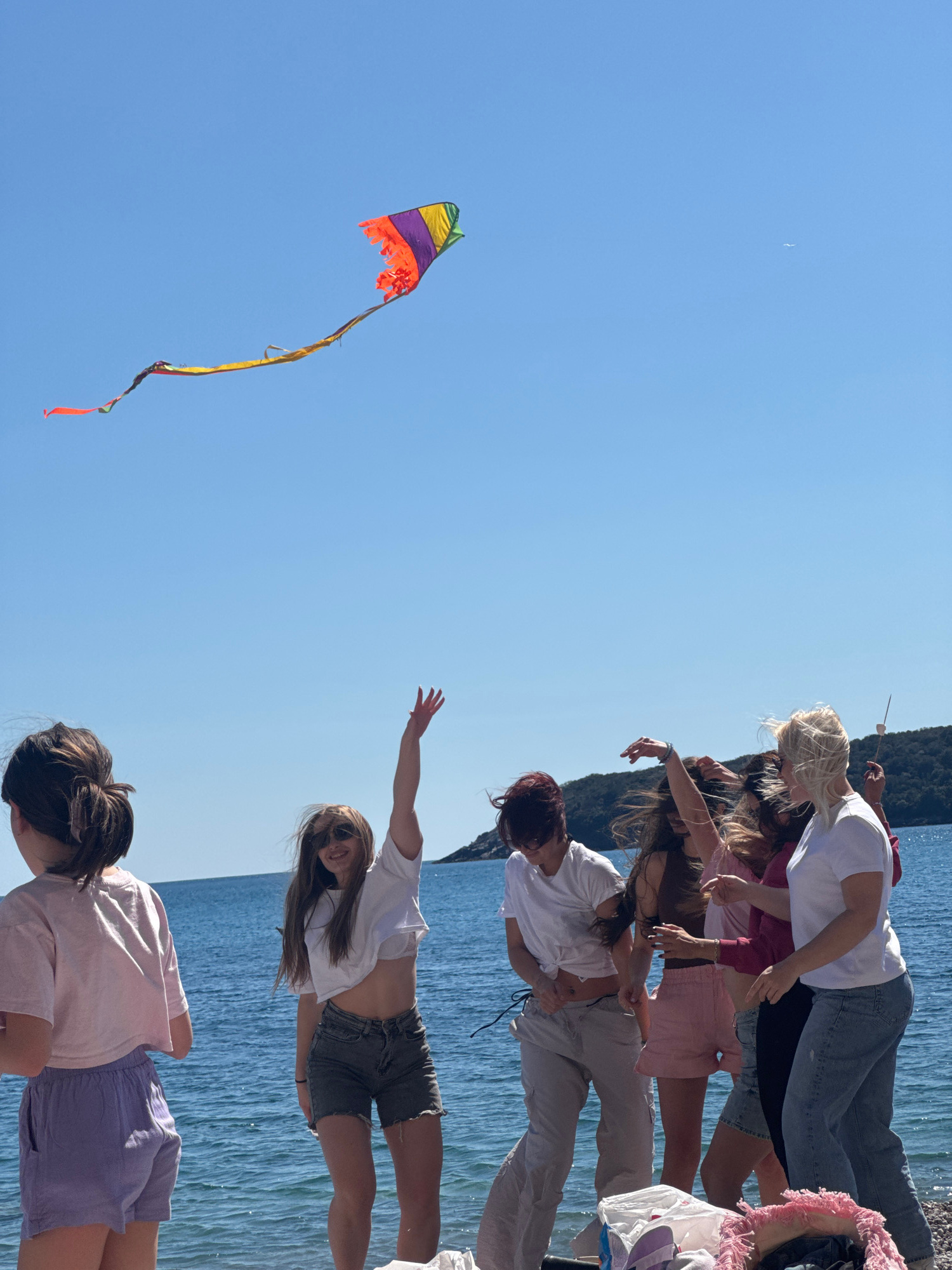 The image depicts a group of people on a beach near the city of Prijevor, Montenegro. The group consists of several young women, mostly wearing casual summer clothing like shorts and t-shirts. They ar…read more