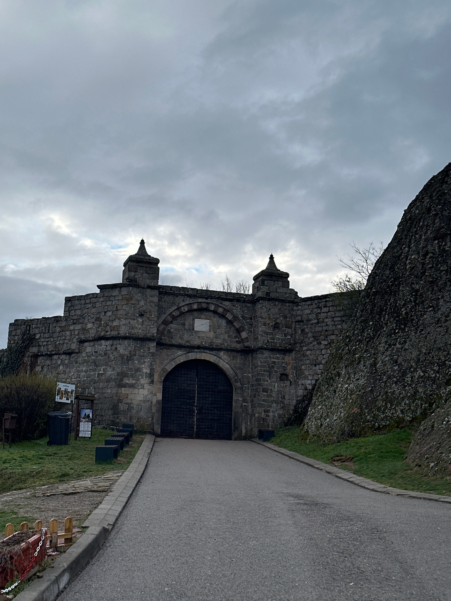 The image shows a stone gate leading into Belogradchik Fortress in Belogradchik, Bulgaria. The gate is made of grey stone blocks with two smaller towers on either side of the main arched entrance. The…read more