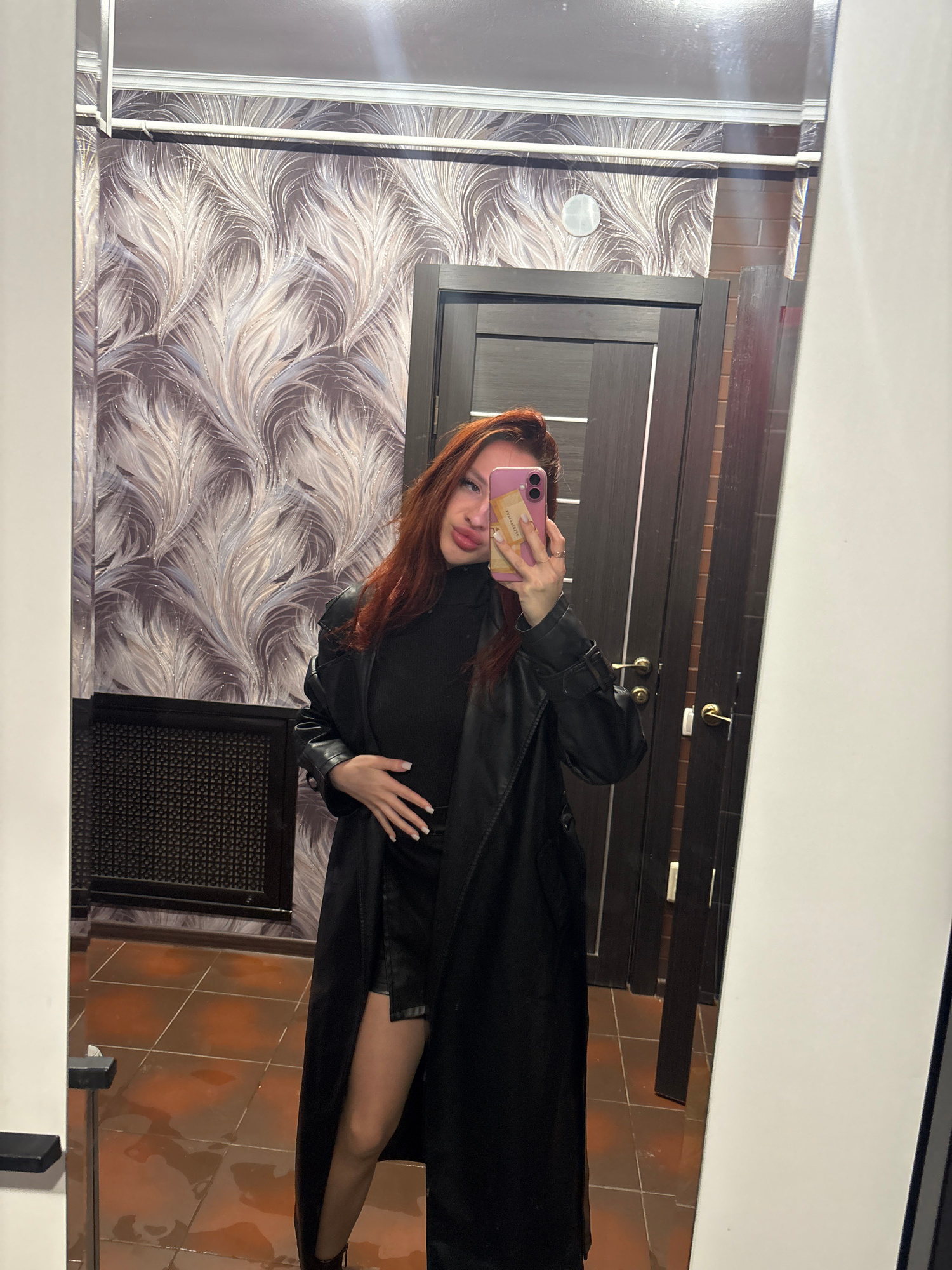 A woman stands in a room, taking a selfie in a mirror. She has long, reddish-brown hair, light skin, and is wearing a black outfit including a long leather jacket. Her left hand is slightly raised nea…read more
