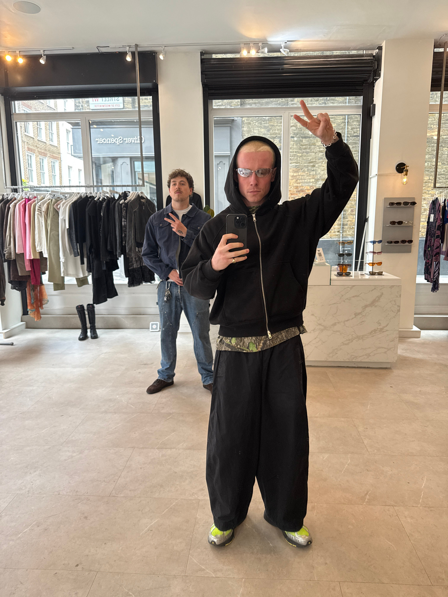 This image captures a selfie taken inside a retail store, likely a clothing or eyewear boutique. The main subject, a young man with blonde hair and glasses, is positioned on the left side of the frame…read more