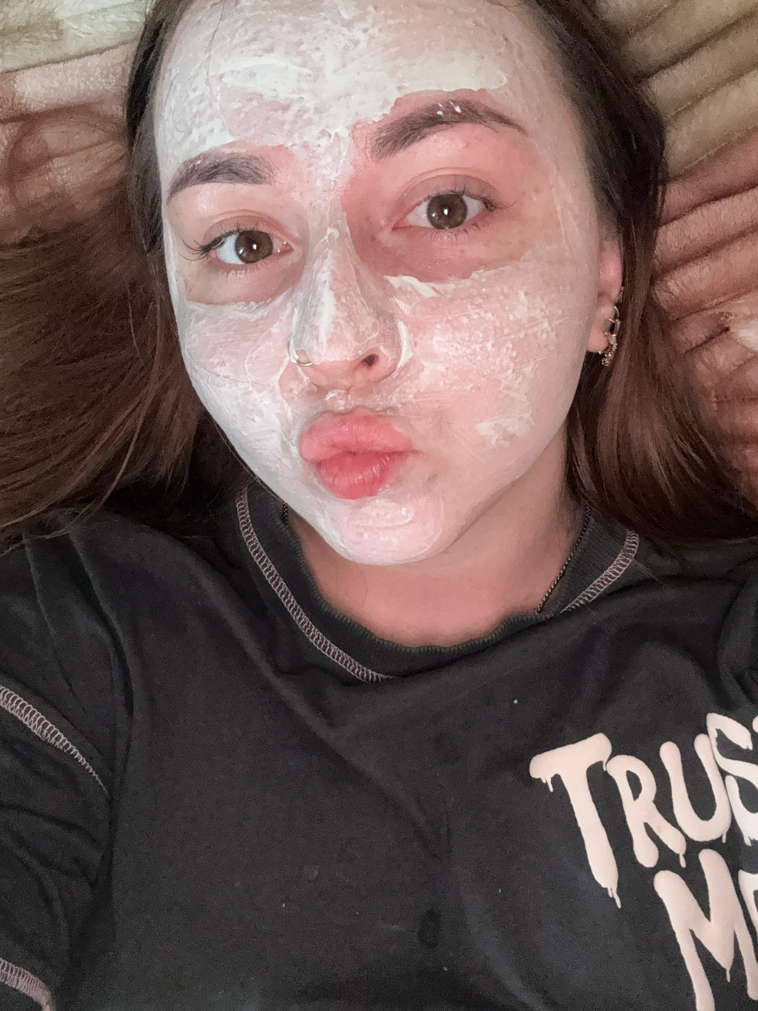 A woman is lying on a surface, presumably a bed or couch, with a white facial mask applied to her face. She is wearing a dark-colored shirt with light-colored lettering, only partially visible, with t…read more