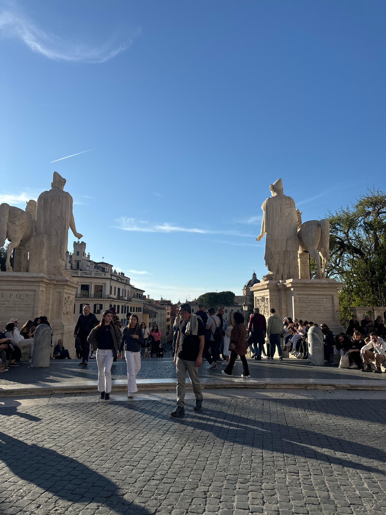 The image shows a sunny, outdoor scene in Rome, Italy, featuring the statues of Castor and Pollux atop the Cordonata staircase leading to the Capitoline Hill. These sculptures, portraying the mythical…read more