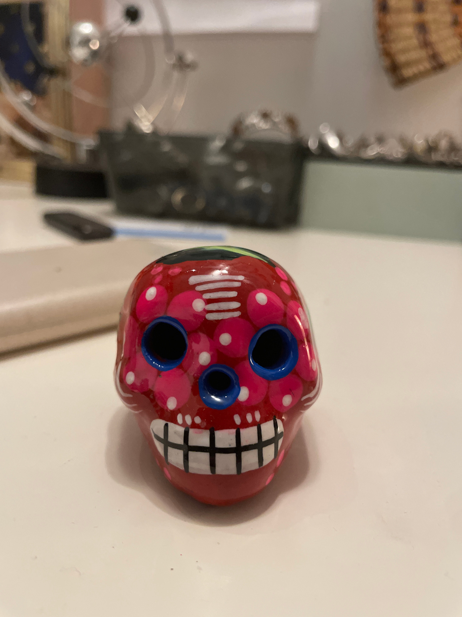 A vibrant, red, ceramic skull, likely a Día de Muertos (Day of the Dead) decoration, is prominently displayed on a flat, white surface. The skull features painted details, including bright blue eye so…read more