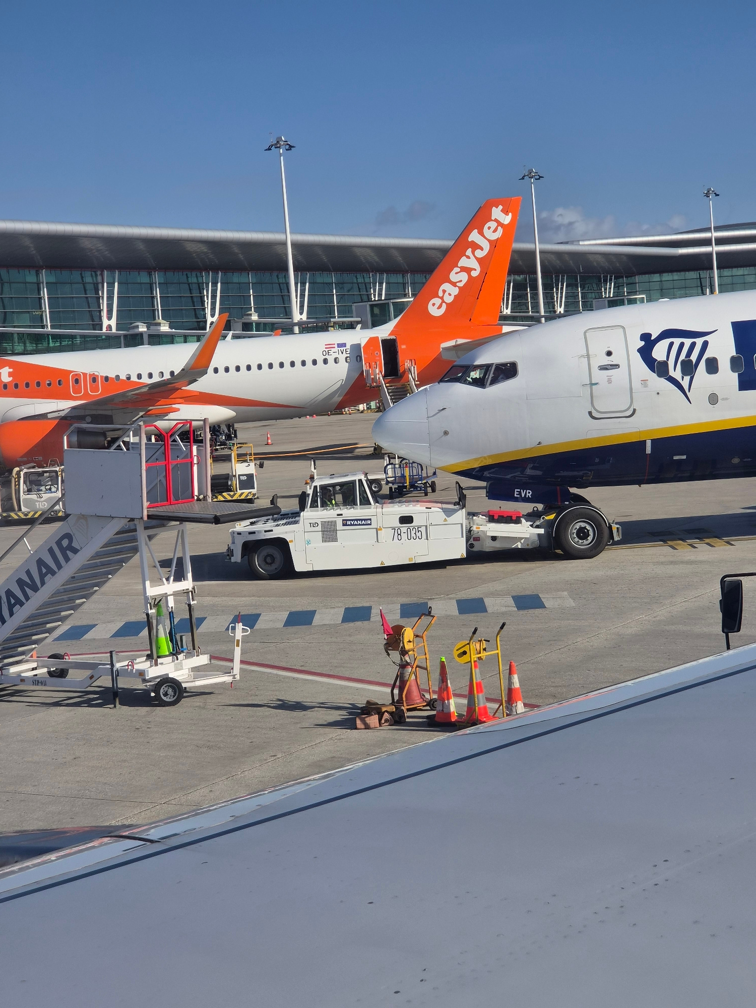 The image shows a partial view of an airport tarmac in Moreira, Portugal. Two airplanes are visible: an orange-and-white EasyJet aircraft and a blue-and-white Ryanair aircraft. Airport equipment such…read more