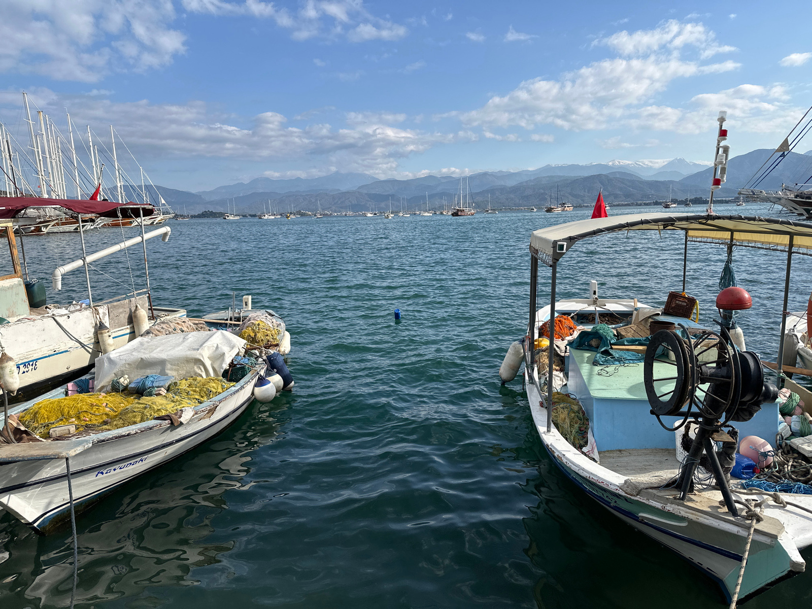 The image captures a tranquil scene in Fethiye, Turkey, focusing on two fishing boats gently bobbing in the harbor's turquoise waters. The boat on the left, named "Kavunaki", is laden with yellow fish…read more