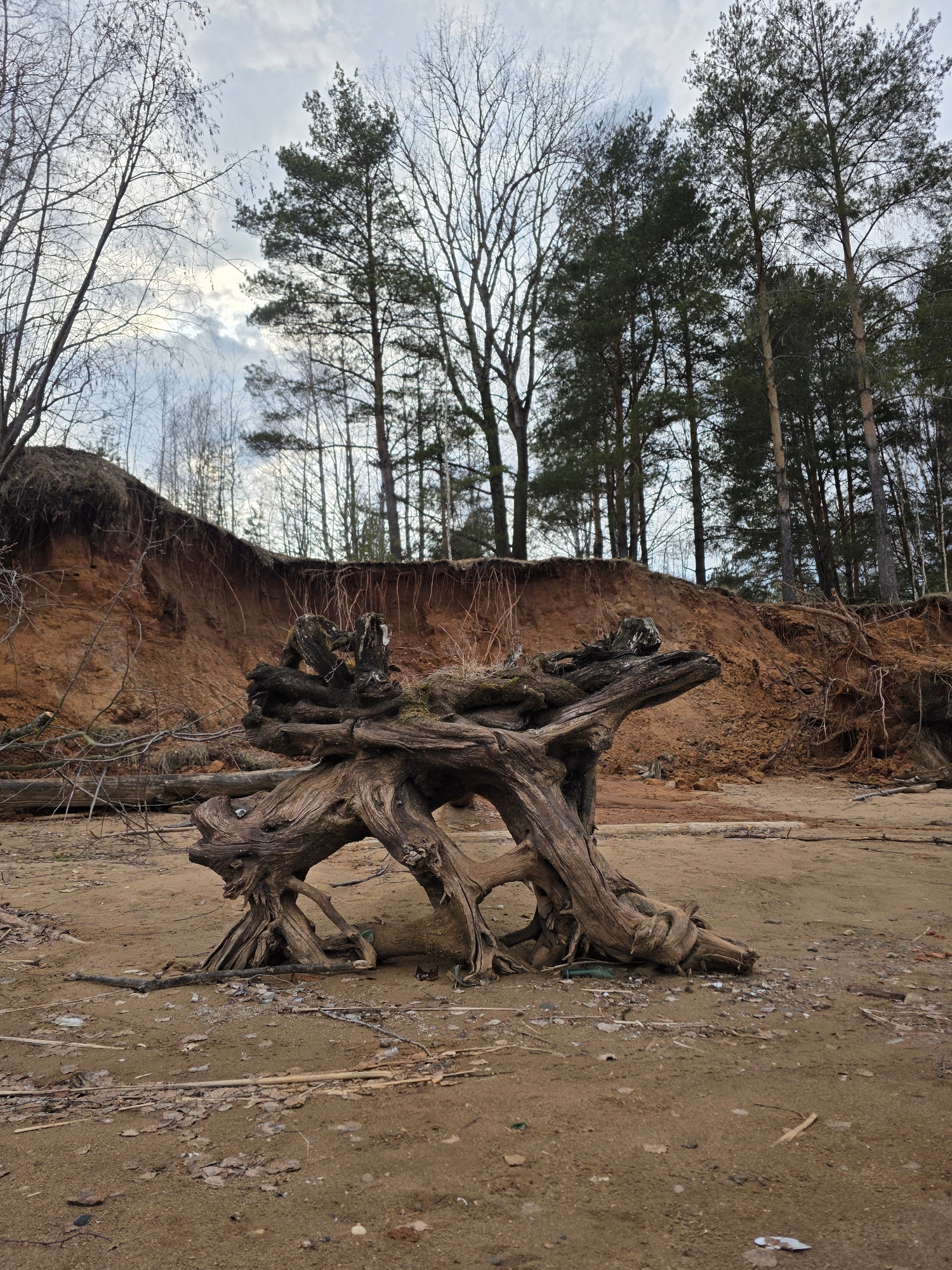 The image depicts an outdoor scene in Chaikovsky, Russia. An uprooted tree trunk lies on a sandy, sloping ground. Behind the trunk, a brown, eroded cliff face rises, revealing exposed roots and soil.…read more