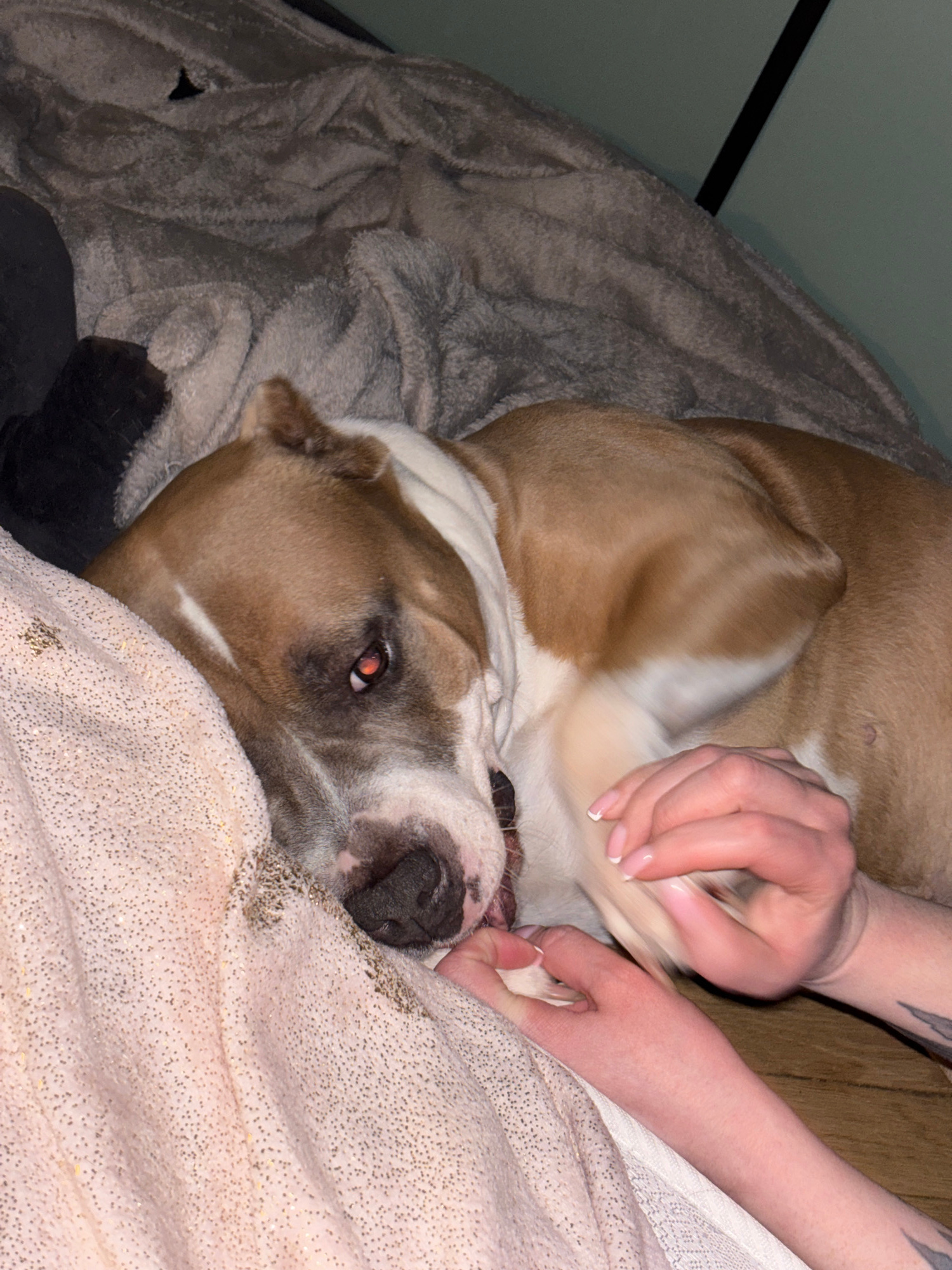The image depicts an indoor scene featuring a domestic dog and a human's hands. **Subject:** A medium-to-large breed dog, possibly a pit bull type or American Bully, is resting centrally. The dog has…read more
