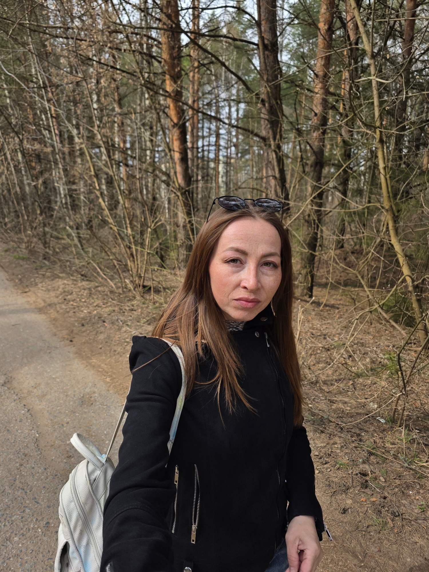 A woman with long brown hair is positioned in the foreground of the image. She is wearing a black jacket and has sunglasses perched on her head. A white backpack is visible on the ground next to her.…read more