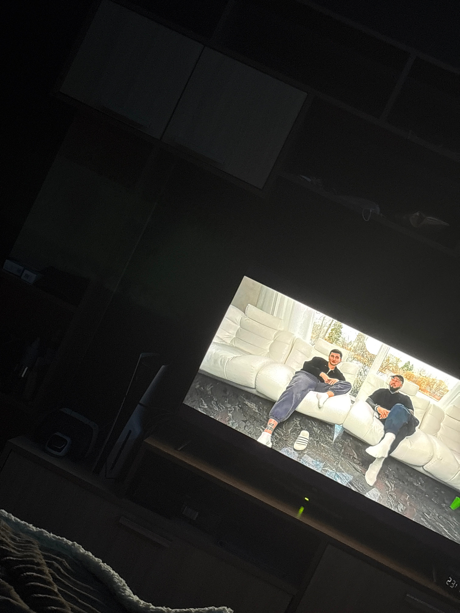 The image shows a television screen displaying two men lounging on a white leather sofa in a bright, well-lit space. The television is positioned in a dark room with a cabinet to the left and what app…read more