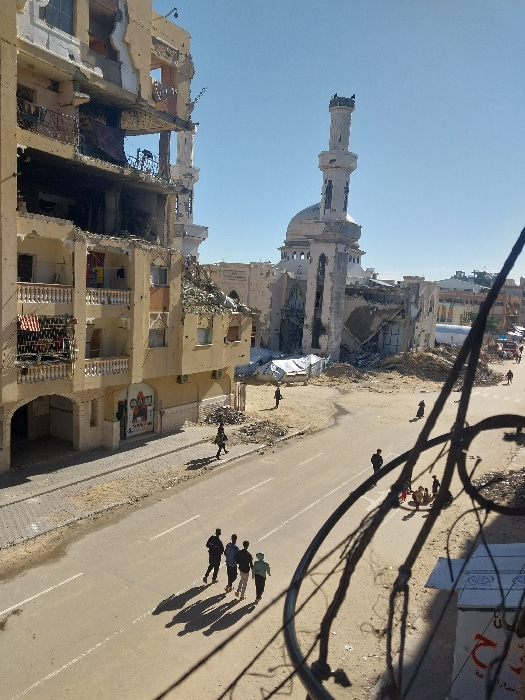 This image depicts a scene of extensive structural damage in the city of Khan Yunis, Palestinian Territory, under a clear blue sky. In the foreground, out-of-focus dark wires or cables partially obscu…read more
