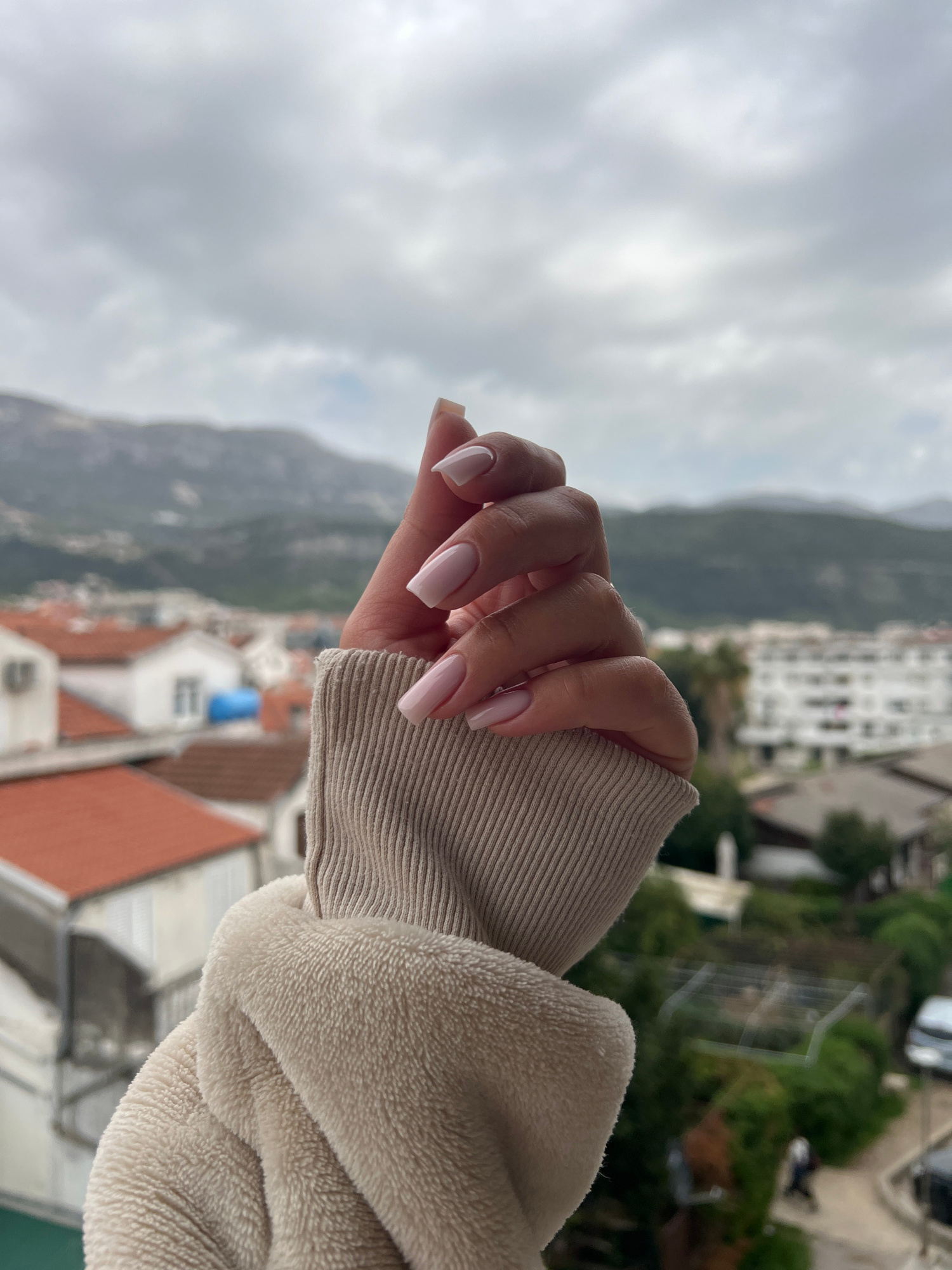 A hand with manicured nails is reaching out in front of a cityscape. The hand is wearing a light beige ribbed sweater sleeve. The fingernails are square-shaped with a light pink base and white tips. Tβ¦read more
