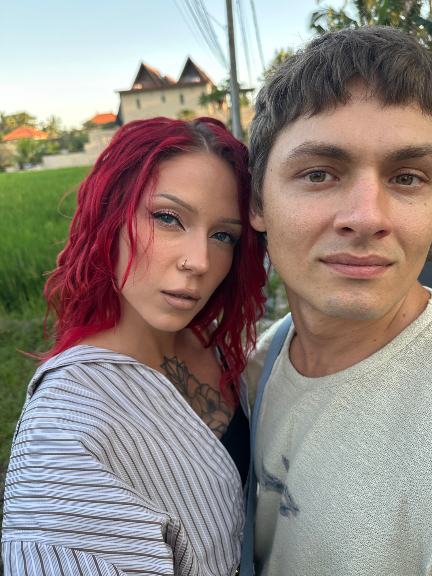 This is a close-up, rotated portrait of a man and a woman taken outdoors during the daytime. The image is oriented with the subjects lying on their right sides. The man is positioned closer to the to…read more