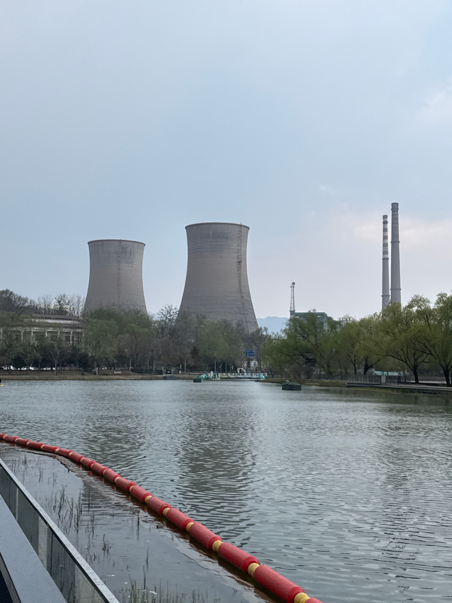 The scene shows a view of the Shougang Industrial Park in the Shijingshan District of Beijing, China. The foreground features a body of water with a red and yellow flotation barrier along a metallic s…read more
