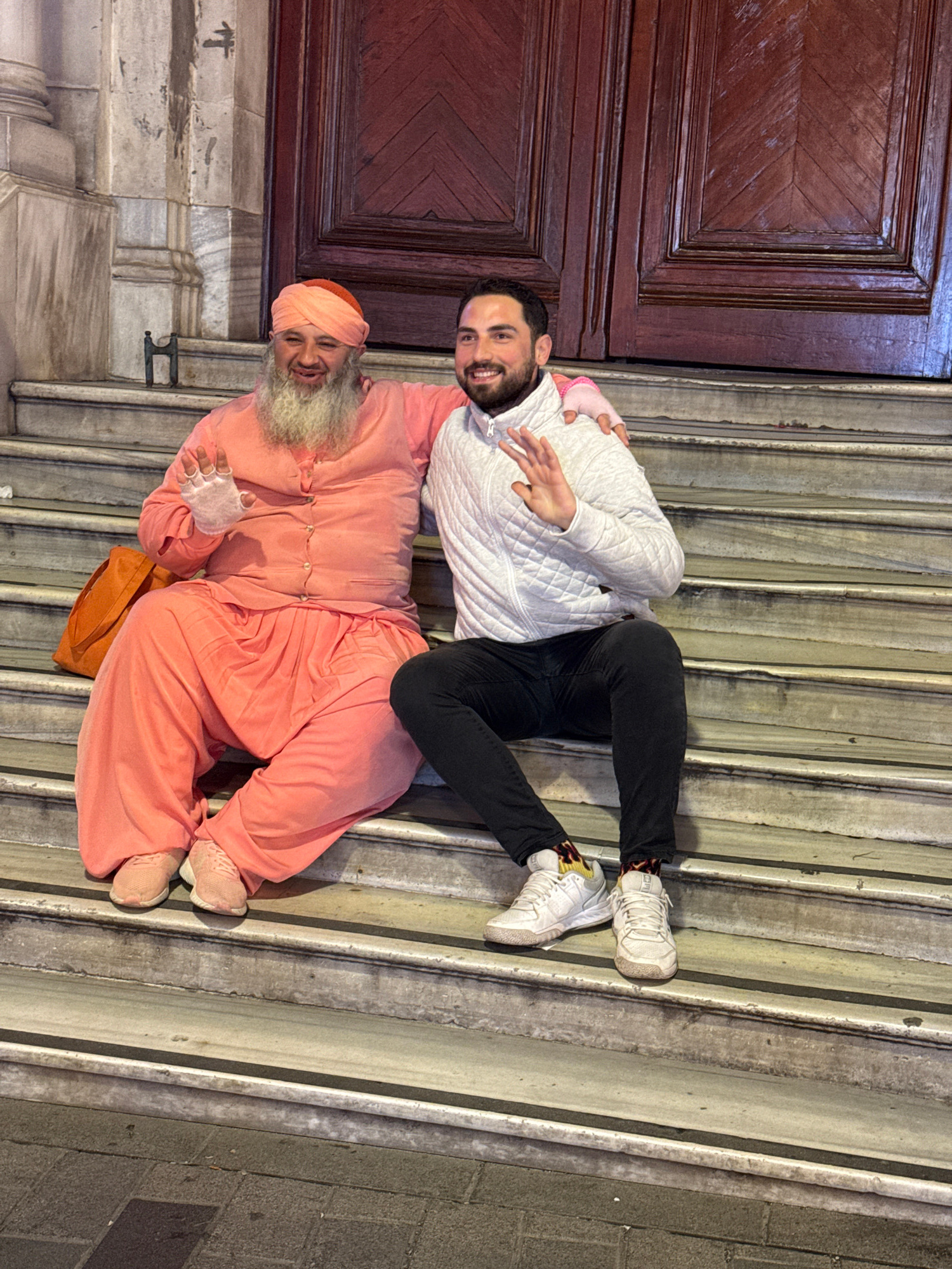 Two individuals are reclining on a set of outdoor steps. One person wears a white quilted jacket, black trousers, and white sneakers with yellow accents; they are smiling, with a hand raised as if gre…read more