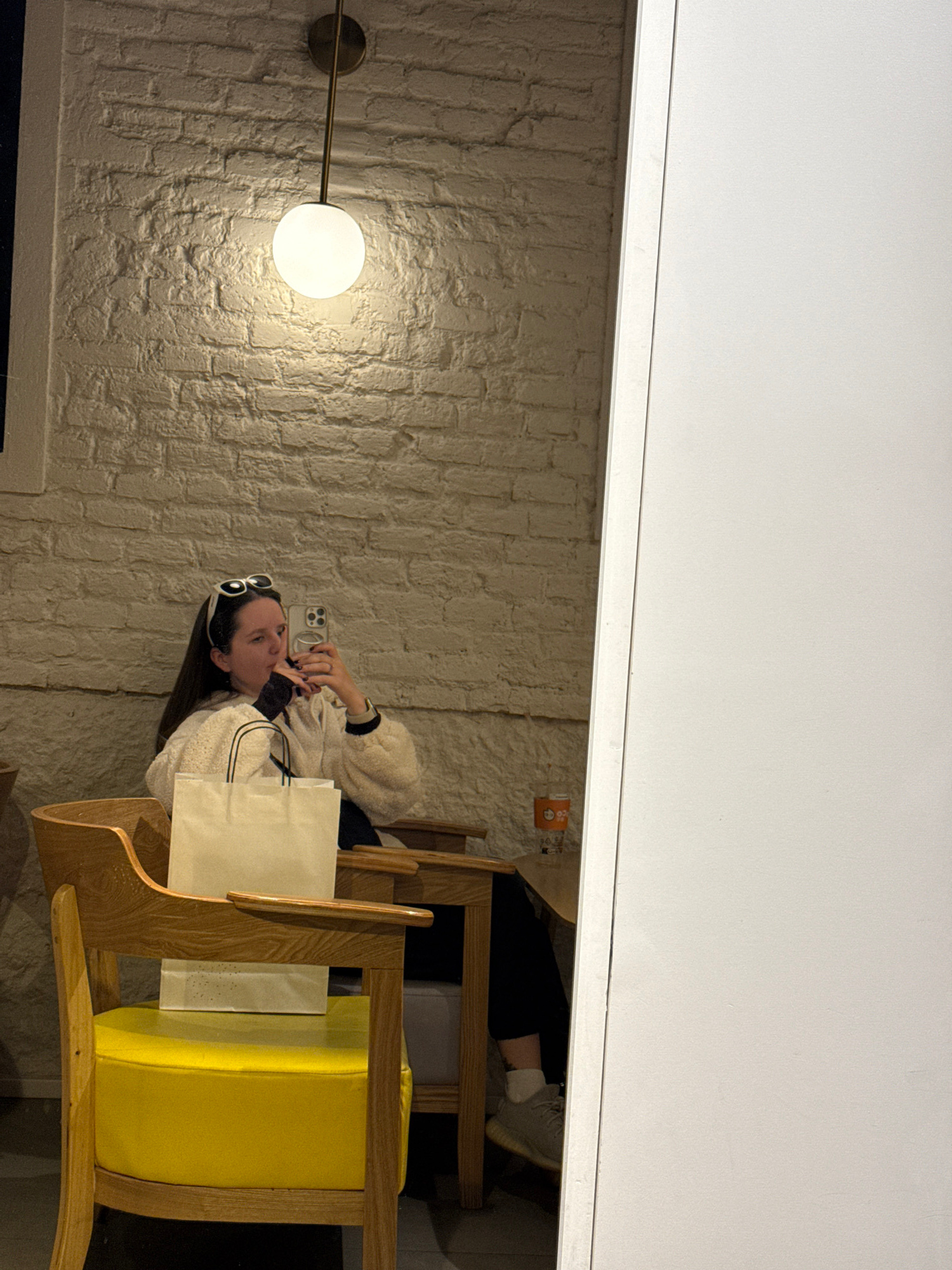 A young woman with white-rimmed sunglasses atop her head is seated in a wooden chair. She is holding a smartphone in her hands, seemingly taking a photo or video. She is wearing a white, textured sweater with dark stripes on the sleeves. Adjacent to her are several shopping bags. The seating arrangement includes a yellow cushion on one of the chairs. The background features a white brick wall illuminated by a wall-mounted light fixture. Based on the architectural style and ambiance, the location could be a shop or cafe in Barcelona, Spain, known for its modern and artistic interiors. There is also the leg and shoe of another person visible in the shot. | Open Wire