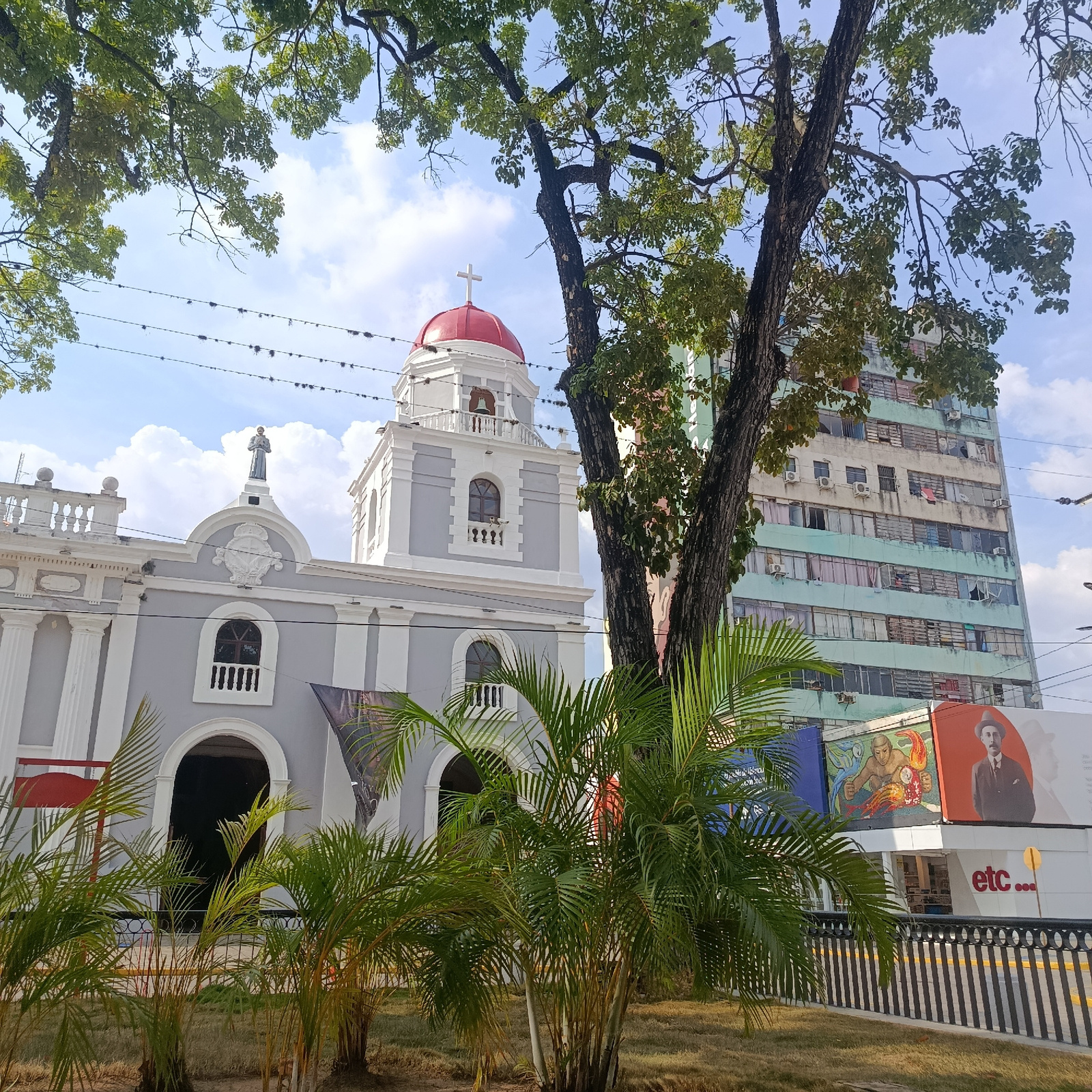 The image presents a scene in Valencia, Venezuela, prominently featuring the Cathedral of Valencia against a backdrop of urban elements. The cathedral, with its grey and white facade and red-domed tow…read more