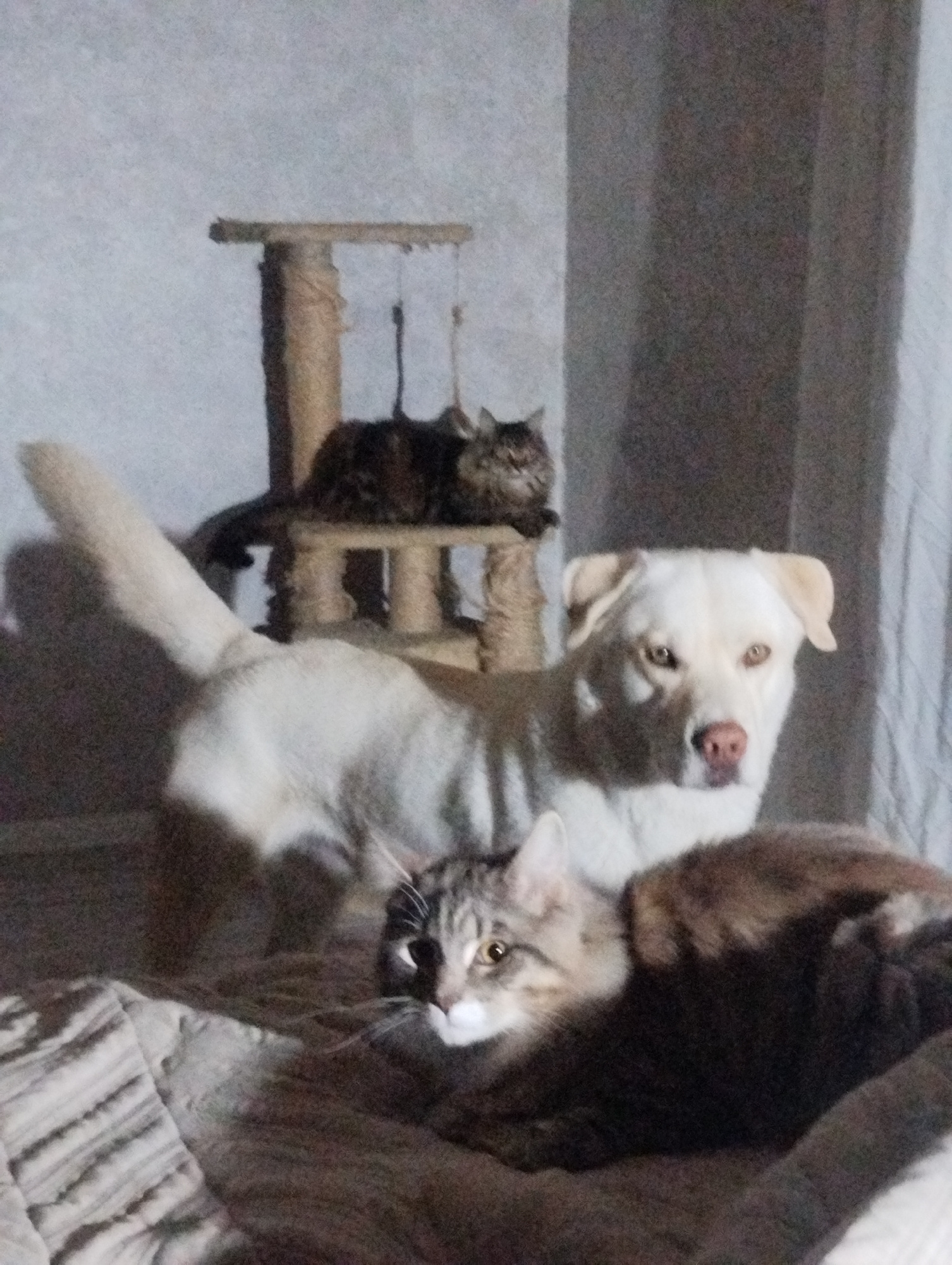 The image depicts two cats and a white dog in an indoor setting. One cat is resting on a cat tree in the background. Another cat is lying on a bed in the foreground. A white dog is standing between th…read more