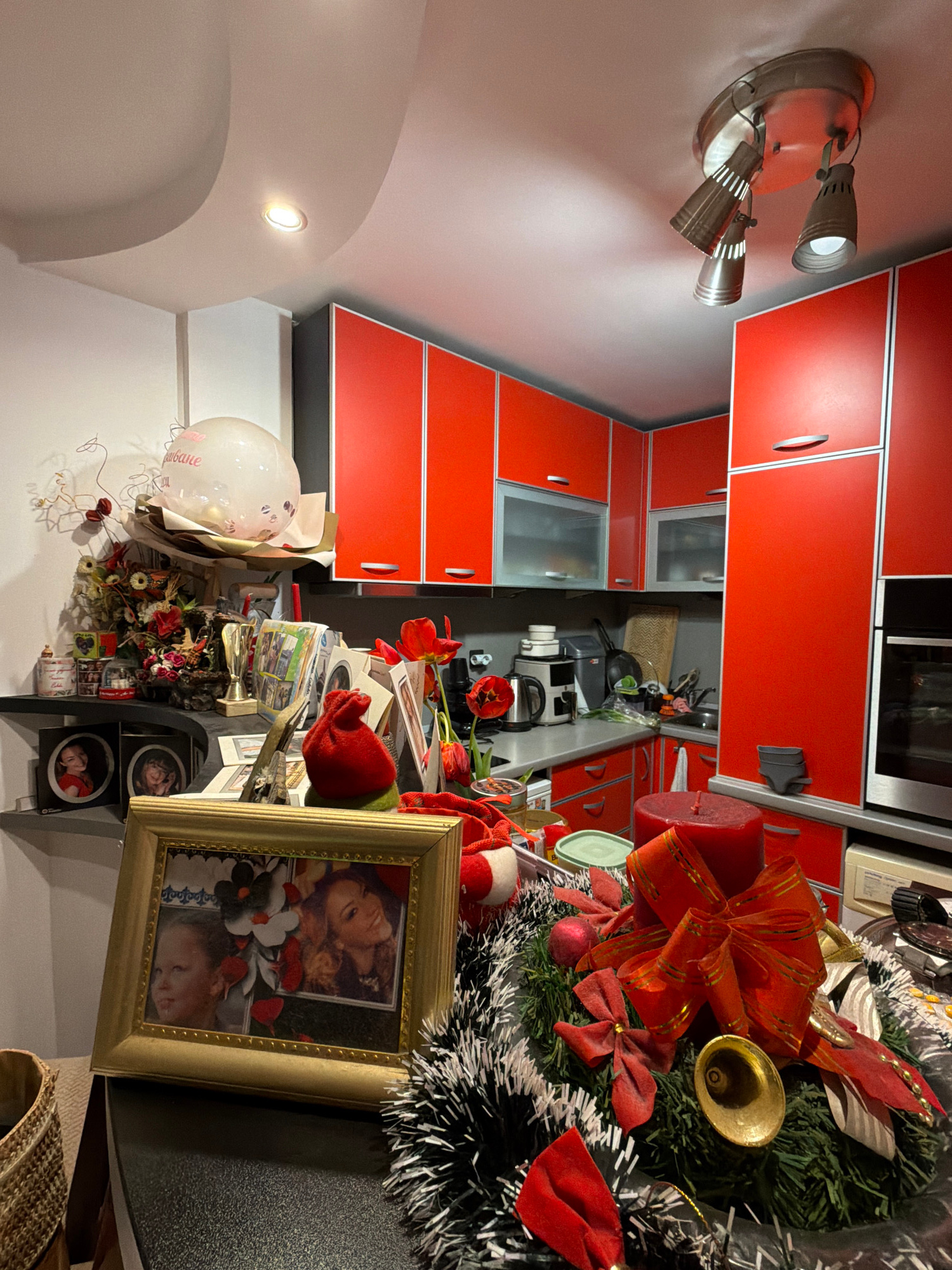 The image shows an interior scene. A kitchen with red cabinets is visible in the background. In the foreground, a cluttered surface holds various objects including a picture frame, a balloon, flowers,…read more