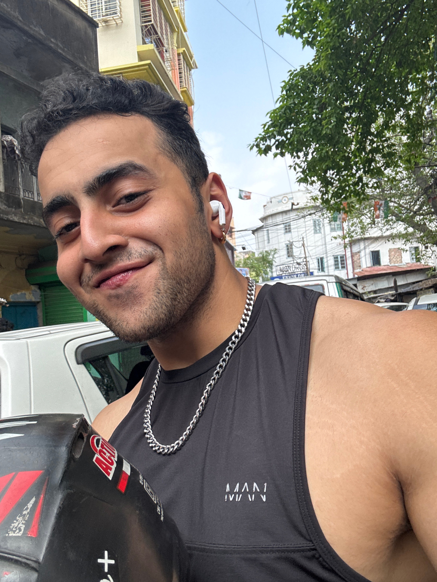 The image is a close-up selfie of a man, likely taken outdoors in an urban setting. The man has dark hair, a beard, and is wearing a black tank top with a silver chain necklace. He has an earbud in hi…read more