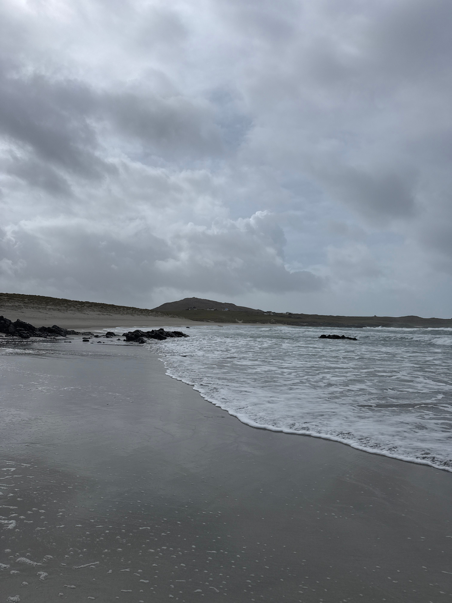 The image shows a grayscale beach scene, likely taken on an overcast day. The sky is filled with dense, gray clouds. The beach slopes down towards the ocean, with the waves washing onto the shore. Darβ¦read more