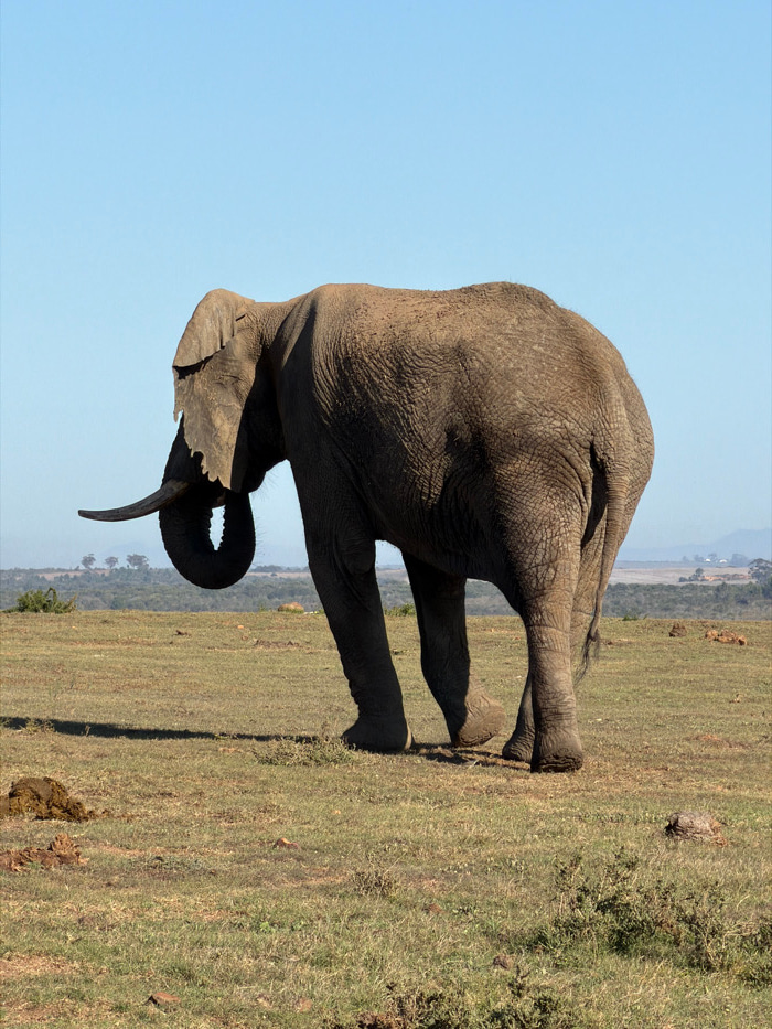 An adult African elephant is depicted in an outdoor environment within Hessequa Nu, South Africa, under a clear, light blue sky. The animal, positioned with its rear and right flank largely facing the…read more