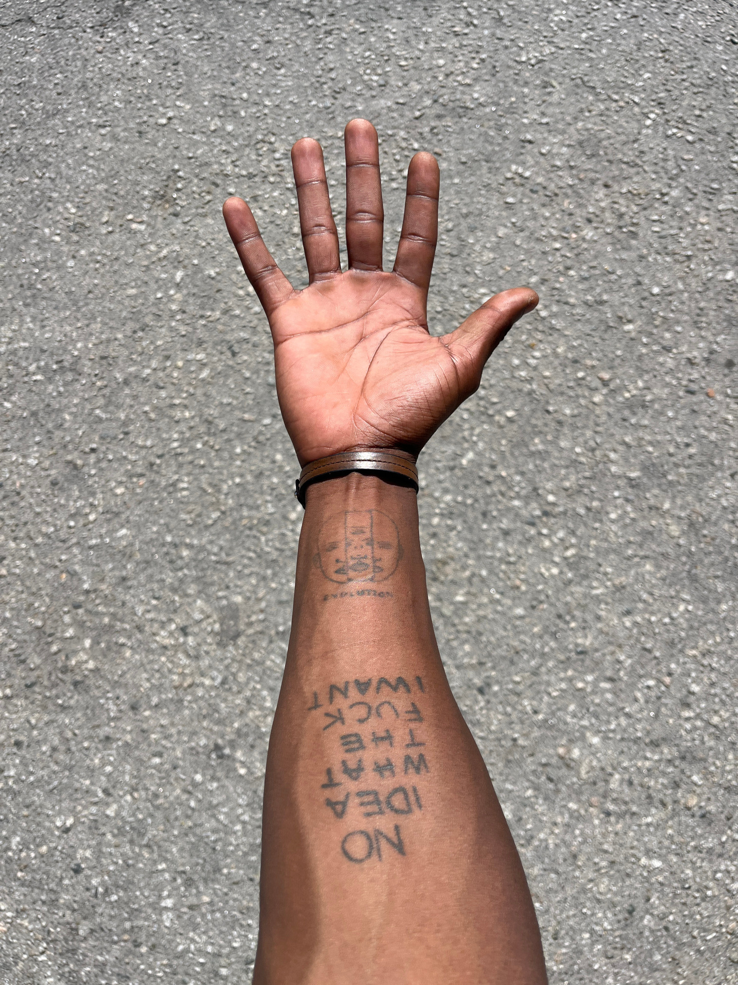 An arm and hand are extended against an asphalt surface. The person has brown skin and several tattoos. One tattoo reads "NO IDEA WHAT THE FUCK I WANT." There is a circular tattoo closer to the wrist,…read more