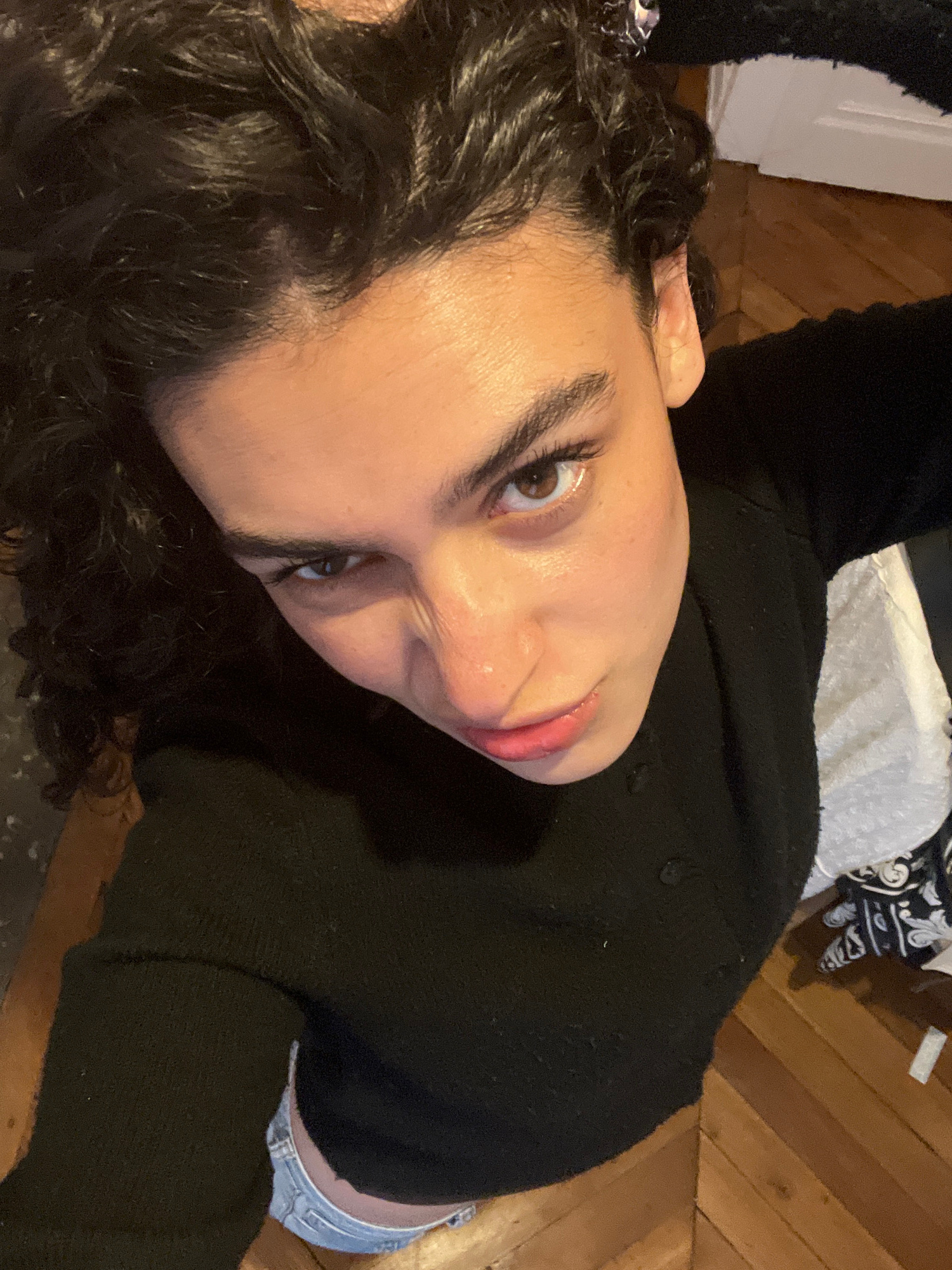 The image is an angled, medium close-up portrait of a young person, possibly female, lying down on a wooden floor in an indoor setting. The subject's head is tilted to the left, and they are looking u…read more