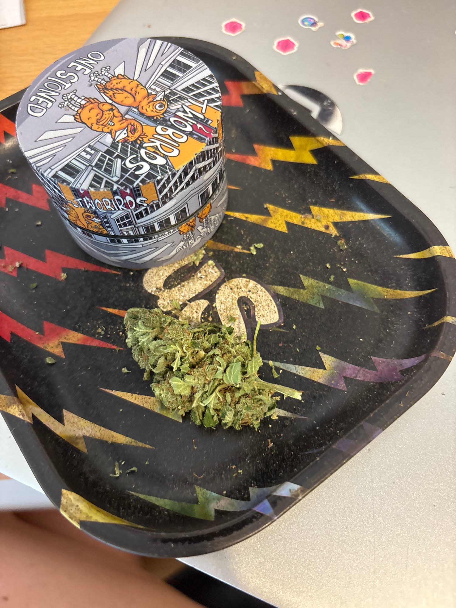 A top-down, eye-level view shows a "Two Birds One Stoned" rolling tray, cannabis, and related paraphernalia on a light surface. The rolling tray is black with colorful lightning bolt designs and some…read more