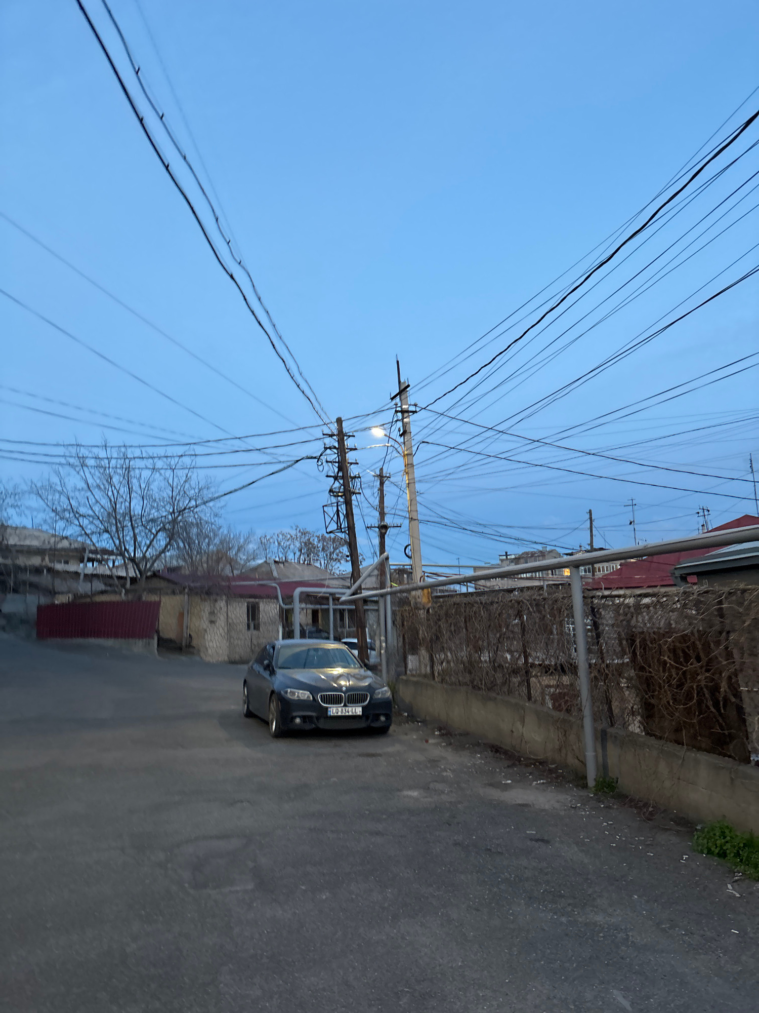 The image captures a street scene in Yerevan, Armenia. The sky is pale blue. Overhead, multiple power lines stretch across the frame. On the right side of the image, a narrow asphalt road is visible.…read more
