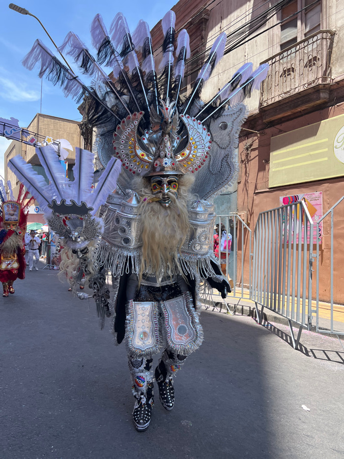 Two people in elaborate silver costumes, possibly from a Bolivian carnival or cultural festival, walk down a street. The costumes feature feathered headdresses, detailed masks with long blonde hair, a…read more