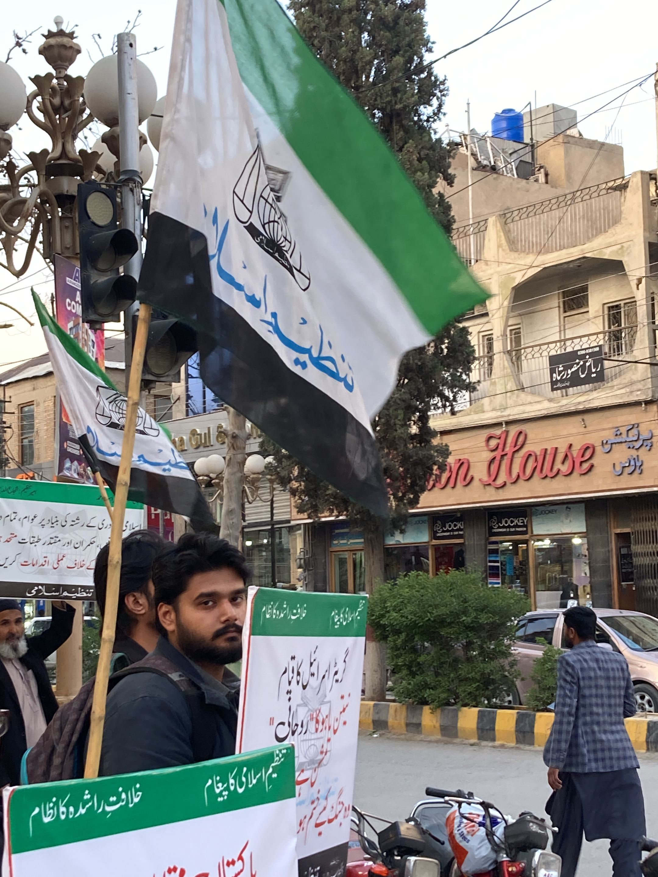 The image depicts a demonstration in Quetta, Pakistan, as evidenced by the Urdu signage and flags. The demonstrators are carrying flags with a white stripe, a black stripe, and a green stripe on top.…read more