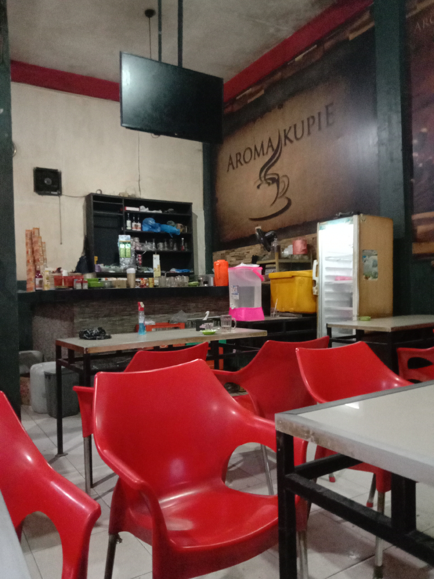 The image depicts the interior of a casual cafe or warung in Lhokseumawe, Indonesia, likely in the evening or at night, given the reliance on artificial lighting. The establishment appears to be empty…read more