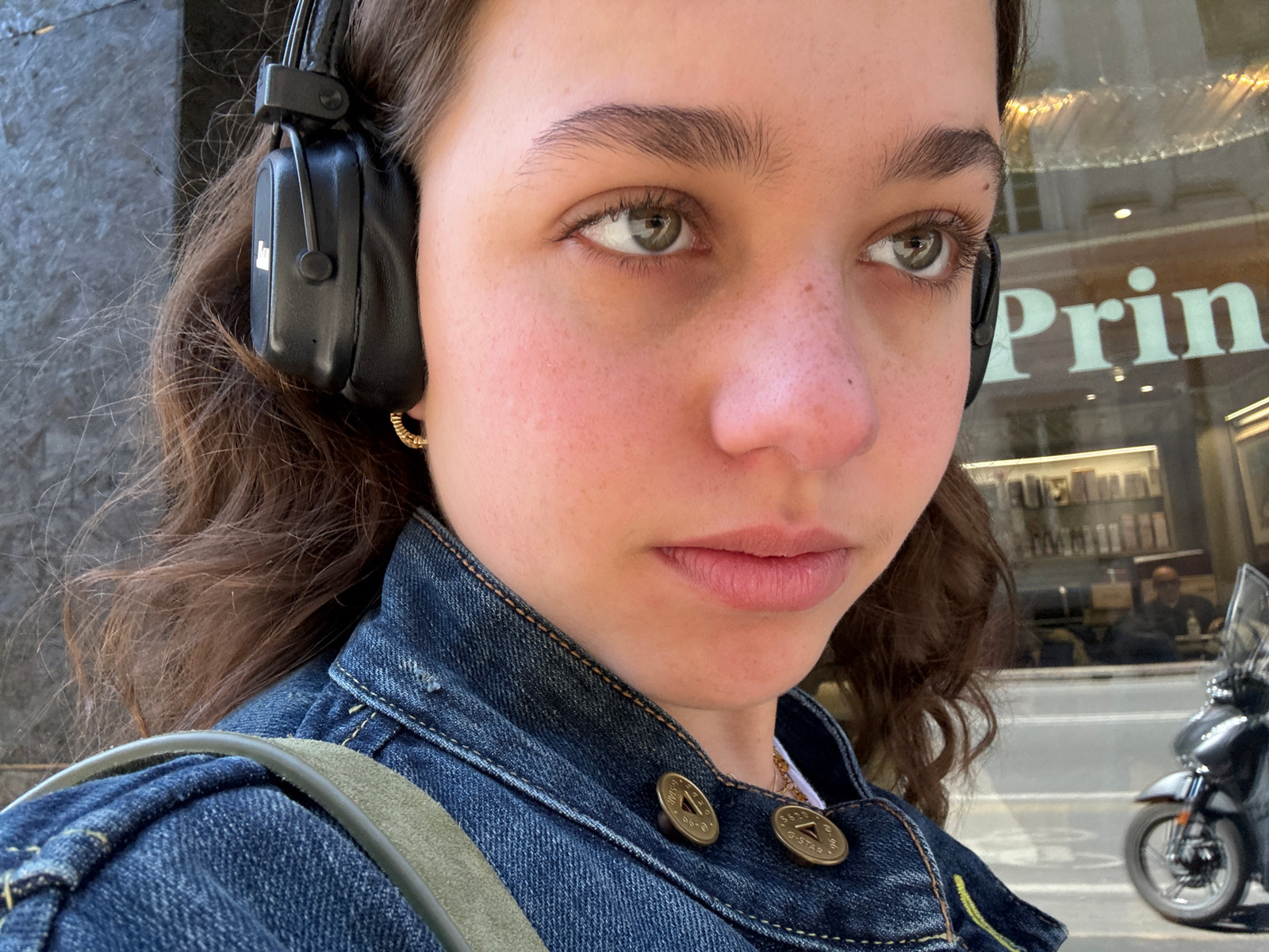 A young woman wearing black headphones and a denim jacket is standing outdoors. The environment is identified as Milan, Italy, indicated by the reflection of a store with "Prin" visible in the store's…read more