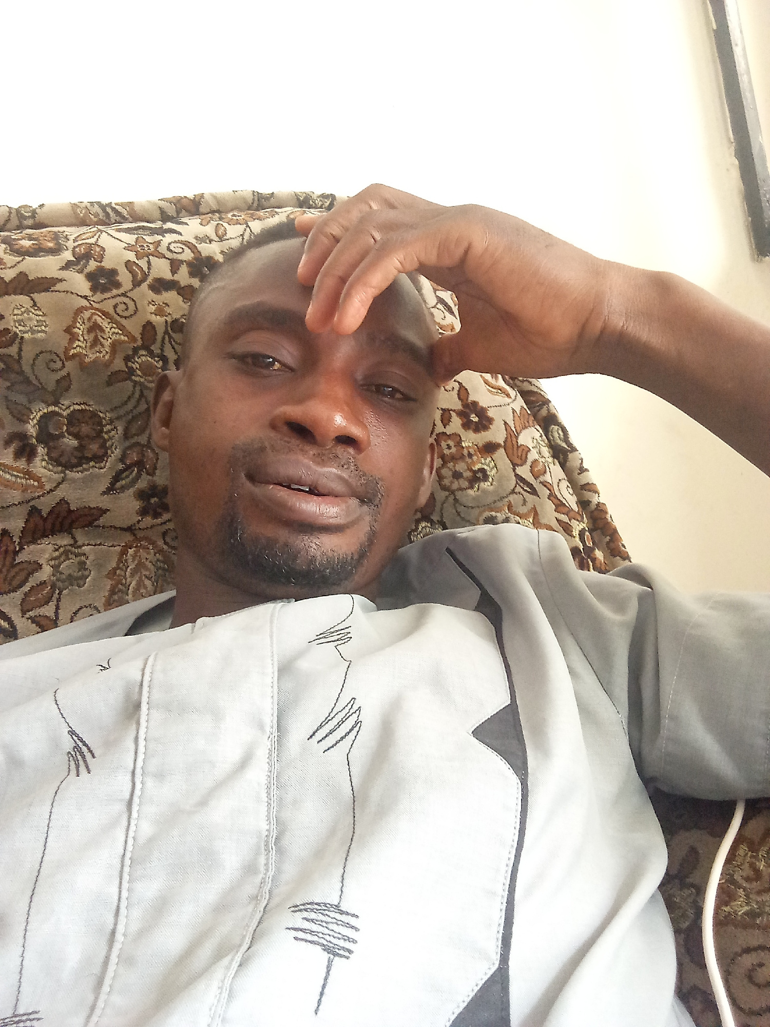 A man is reclining in a patterned armchair, likely indoors. He's dark-skinned, with a short beard and hair, and is wearing a light gray shirt with dark embroidery. His right hand is resting on his for…read more