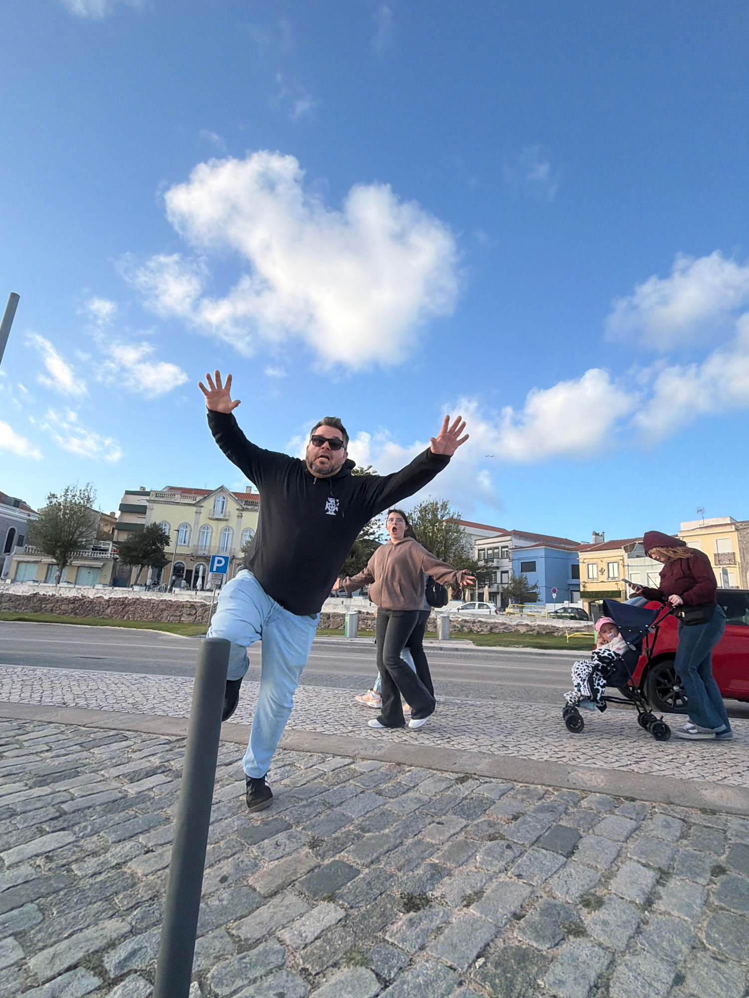 The image shows an outdoor scene in Figueira da Foz, Portugal, featuring a man in a black hoodie, light blue jeans, and sunglasses, standing on a gray metal post. He has his arms outstretched. Behind…read more