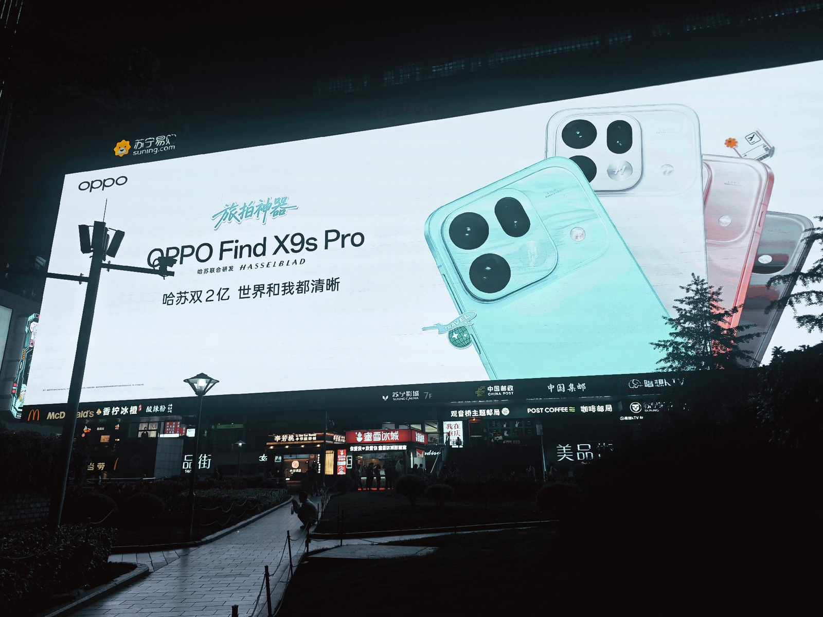 An illuminated nighttime street scene in a commercial district of Liangjiang, China, features a massive LED billboard dominating the upper half of the frame. The billboard prominently advertises the "…read more