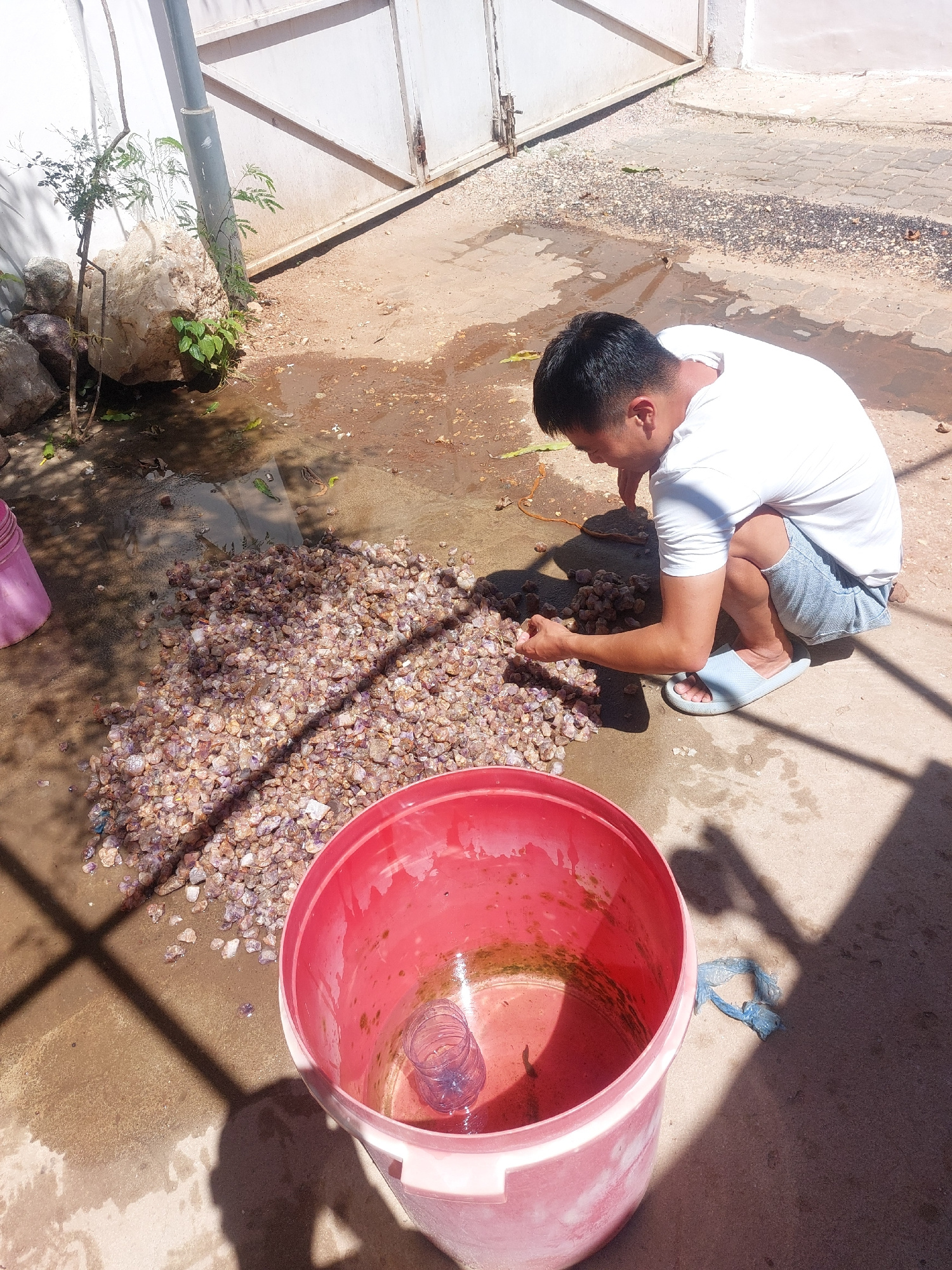 A man is kneeling on a concrete surface in direct sunlight, sorting through a large pile of what appears to be amethyst gemstones. He is wearing a white t-shirt, patterned shorts, and blue sandals. Ne…read more
