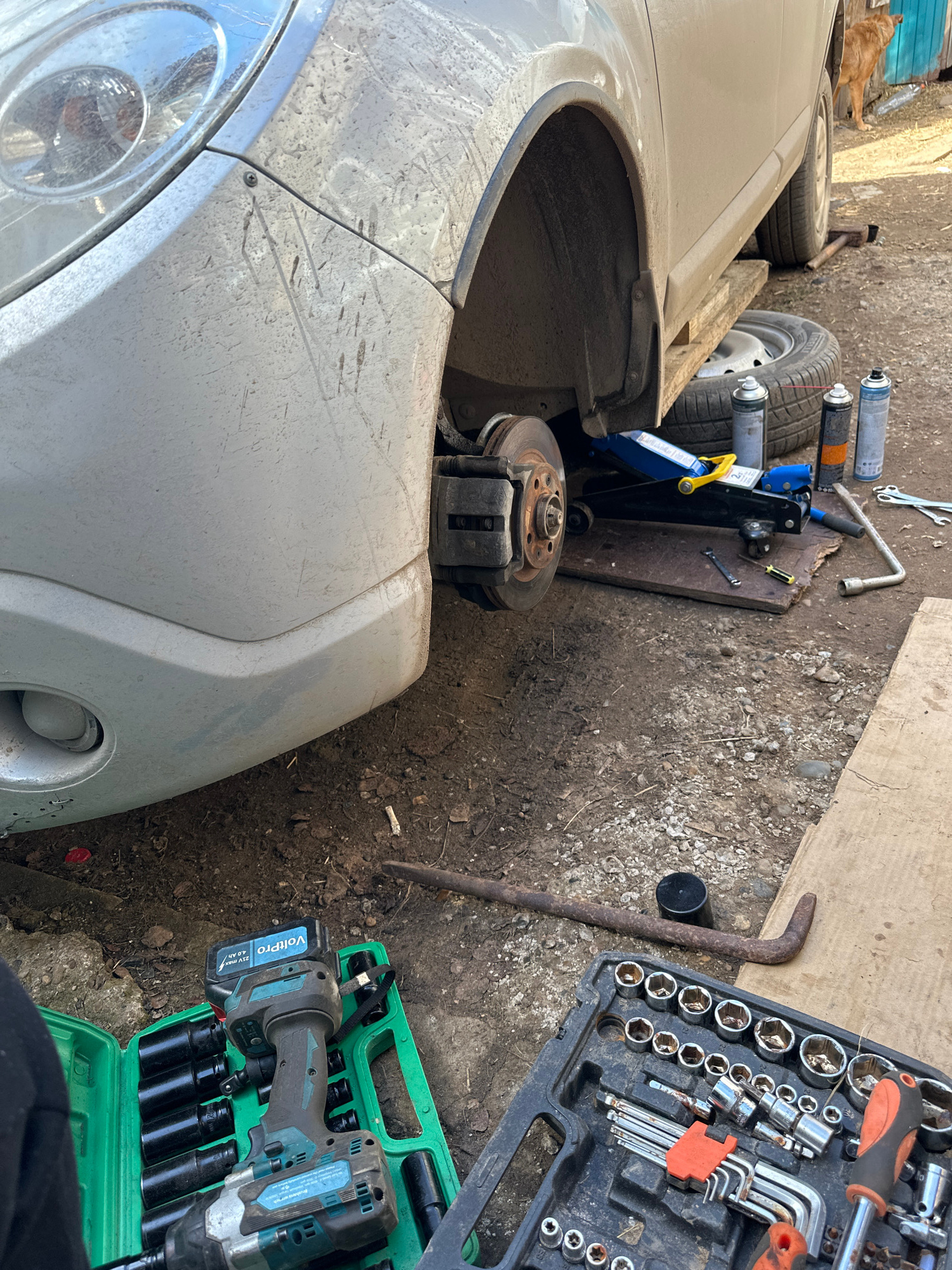 The image depicts an outdoor auto repair scene, possibly in Mozhga, Russia. A silver-colored car with a missing front wheel is prominent, revealing a rusty brake rotor and caliper. Adjacent to the car…read more