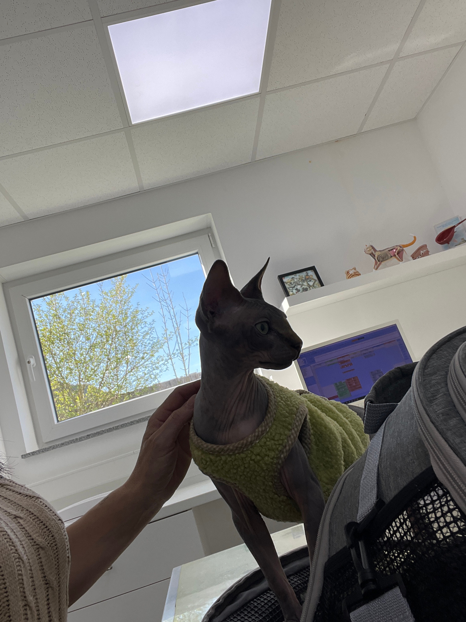 A Sphynx cat, wearing a light green, textured sweater, is the central subject of this brightly lit, interior shot taken at a tilted angle. The hairless cat, with its striking green eyes, is held uprig…read more
